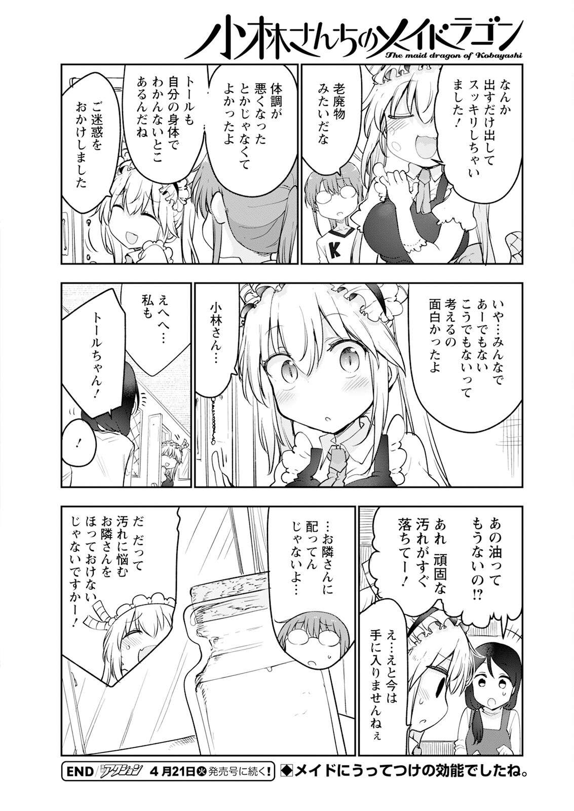 >>287313415Tohru: I just let it all out and feel totally refreshed!Kobayashi: Sounds like waste material.Kobayashi: I'm glad it wasn't because you got sick or anything. You have parts of your own body you don't understand either, huh?Tohru: Sorry for the trouble.Kobayashi: No... It was fun thinking about it with everything, like this or that.Tohru: Kobayashi-san...Tohru: Ehehe... Me too.Sasakibe: Tohru-chan!Sasakibe: !Sasakibe: Is that oil all gone now?! Whoa, the stubborn stain came right off!!Tohru: Uh... Um, it's not available right now.Kobayashi: ...I'm not handing it out to the neighbour...Tohru: B-because I can't just ignore the neighbour struggling with that stubborn stain!It had the perfect effects for a maid, didn't it?