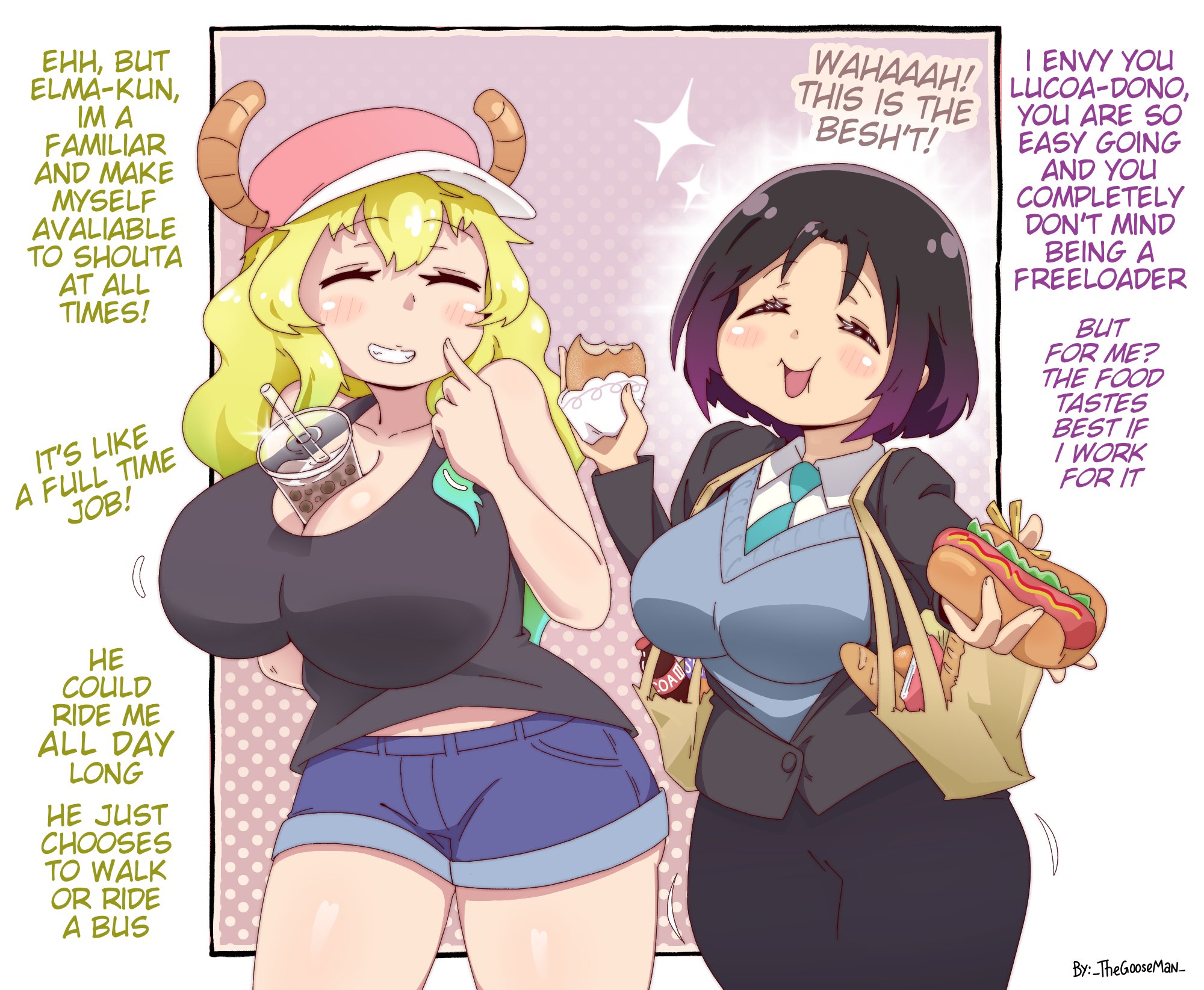 >>287313143Kobayashi: I still don't know all of Tohru's secrets, huhElma: Being here makes me forget about myself too...Elma: My true self secretes from the mouth, after all...(MTL translates it as 'cums', so I assume there's a pun I'm missing)Kobayashi: Even in human form, that's how it is, right?Elma (presumably): Tohru, I'm here - came to check on ya!Elma (presumably): How's it goin'?Tohru: Doesn't look like it's gonna stop anytime soon, huhSFX: NYURURU, NYURU...Kobayashi (presumably): What a cool pose she's striking(This page was difficult to make sense of)