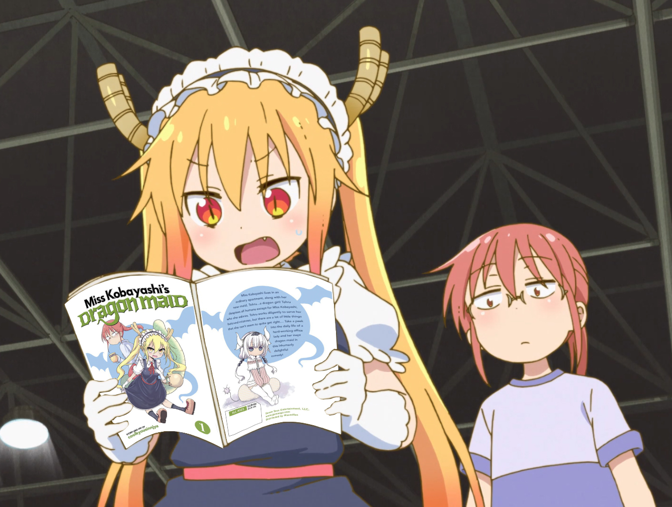 >>287313102Tohru: Actually, there was something I've been feeling complex about until now.Kobayashi: That's a sudden coming out.Tohru: You know how games and manga have attributes, right... I haven't really been conscious of it strongly until now, but... For example, Kanna is lightning attribute...Tohru: Ilulu is fire attribute.Ilulu: G'morning... What the heck is that slimy thing!!Tohru: Elma is water... Fafnir is darkness... Lucoa is light, something like that? So then I thought, Tohru doesn't have an attribute, right... But this time...Tohru: SO, IT'S OKAY TO SAY THAT TOHRU HAS ACQUIRED THE OIL ATTRIBUTE??Kobayashi (presumably): OIL ATTRIBUTE!?Ilulu: Tohru can breathe fire too, so fire attribute is fine, isn't it...Tohru: THEY'RE OVERLAPPING, RIGHT? I HATE THAT!Ilulu: She hates overlapping... Thanks for yielding the fire attribute...