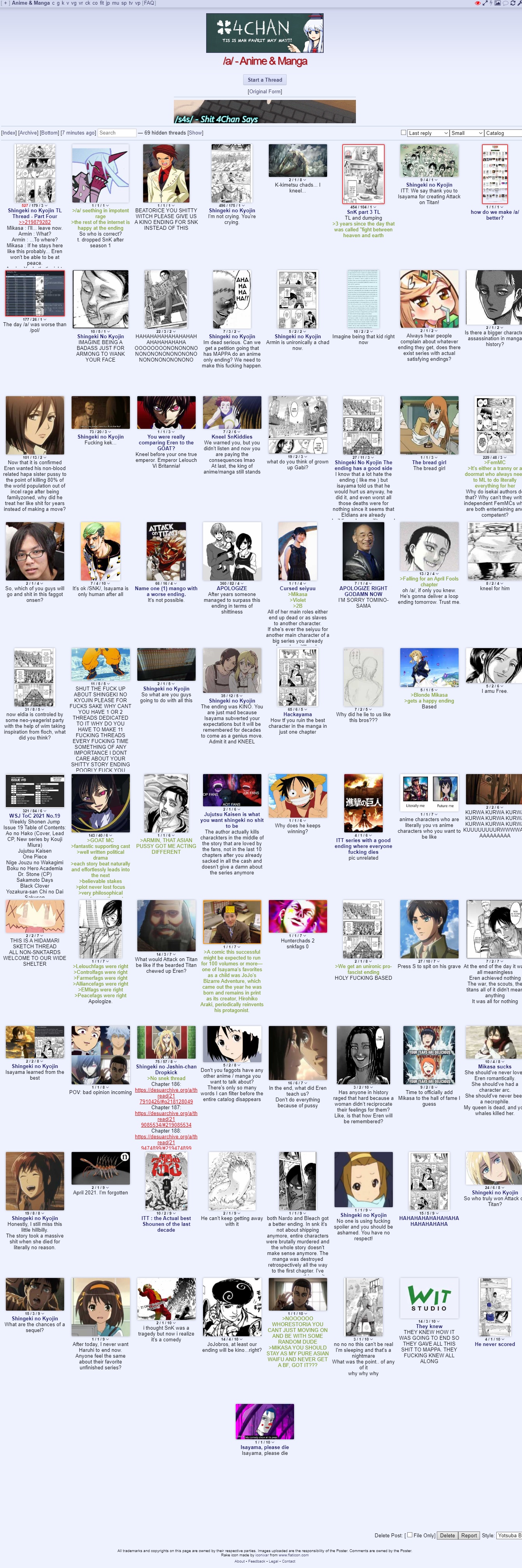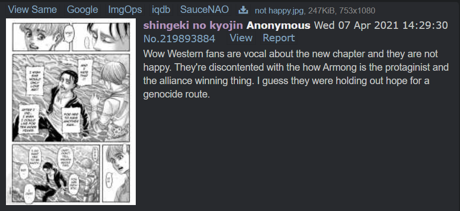You don't know how happy I am to see SNK fumble its final arc like that, as it became shit the moment Eren became a titan. More than 10 years of normalfags praising it was so fucking annoying.