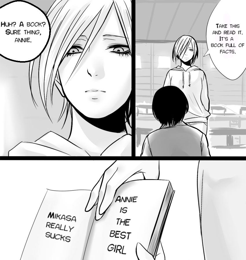 >>287328588man I would love to go back 10 years in time with that Mikasa visiting Eren's grave panel and just write "Mikasa fucked Jean" and leave.