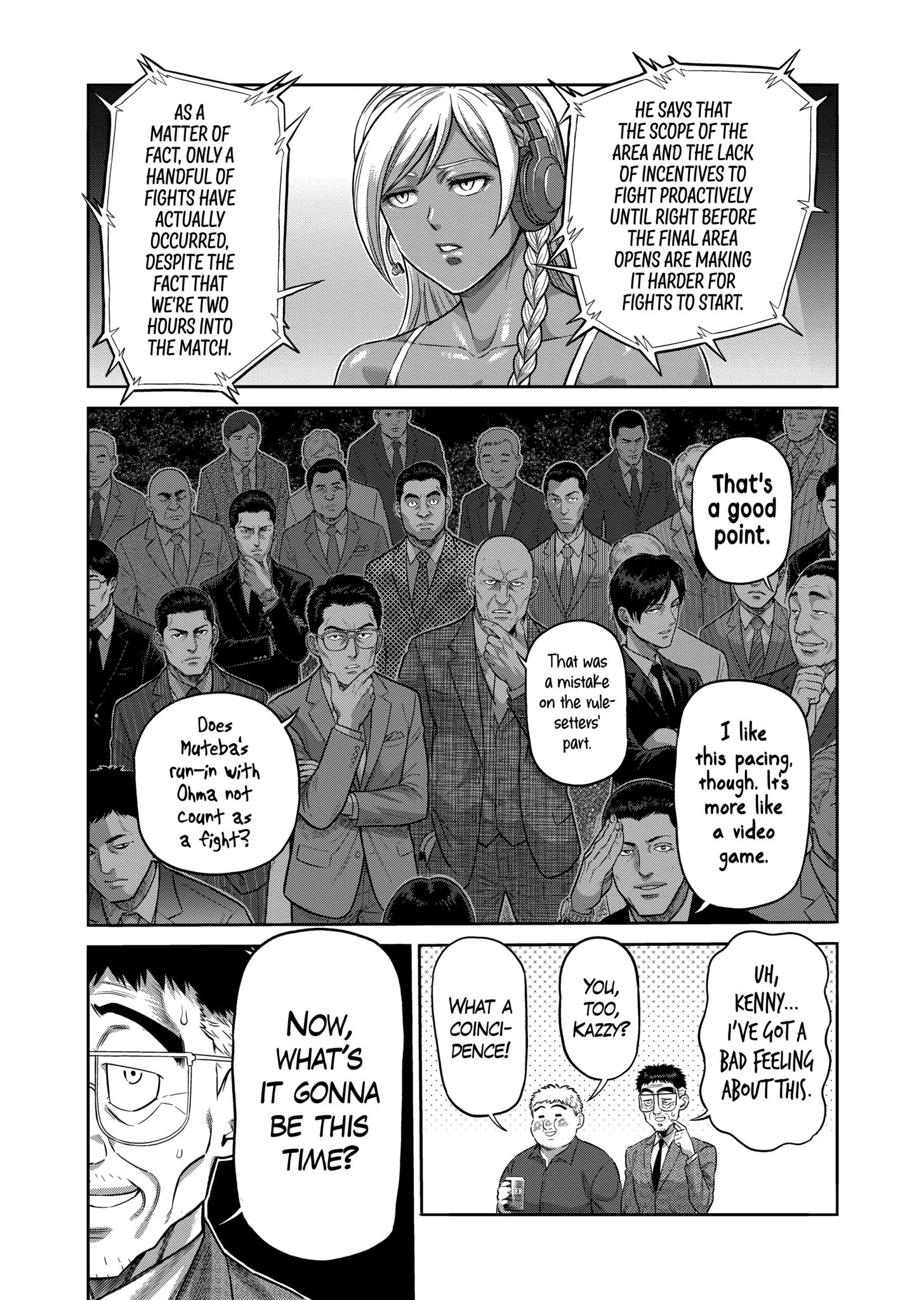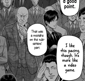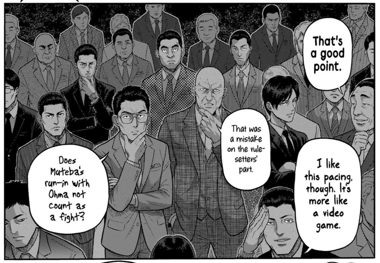 My favorite thing about the patches is that they exist solely to make sure that none of the characters get tainted by abusing the rules or exploiting the loopholes.Like, I don't want to interpret people's intentions. But this chapter makes me believe that he doesn't want any critique that questions why none of these guys attempt to act underhanded. You can't make all of them clean, so make it impossible for them to do the logical things that contestants would do.The man literally cannot fathom morality beyond an extreme lense. Sure this is still a shounen but even for such a demographic this is ridiculous!