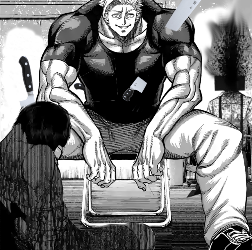>>287350842Here me out. >Raian has Gilbert on the ropes but looks chill by comparison>Gilbert is hulking out, seething, crying, shaking like an exhausted racehorse>Suddenly Raian gets this gruesome grin as he declares he's "bored" and wants to give "someone else" a turn with his favourite toy because he's such a "nice guy">ENTER Kaneda>He has a knife in his hands, is barechested, and is matching Raian's cuhrahzee grin>He still wins, somehow