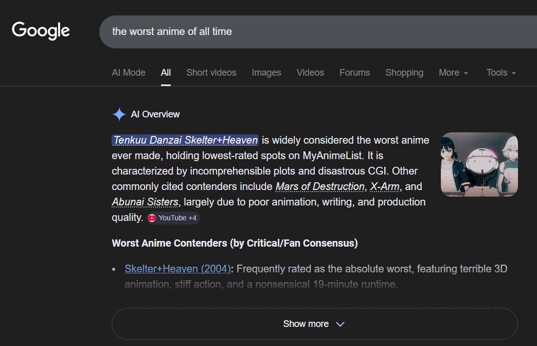 Is Google right? Is Tenkuu Danzai Skelter the worst anime of all time?
