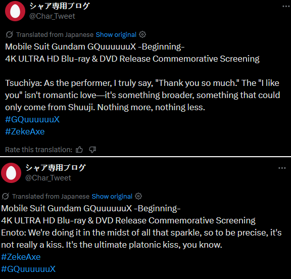 >>287366296>Reminder that the Machu and Shuji are confirmed as a platonic friendship by the director and writer with no romantic vibes intended.They are as platonic as Char and Amuro, I mean Lalah. actually I do mean Amuro