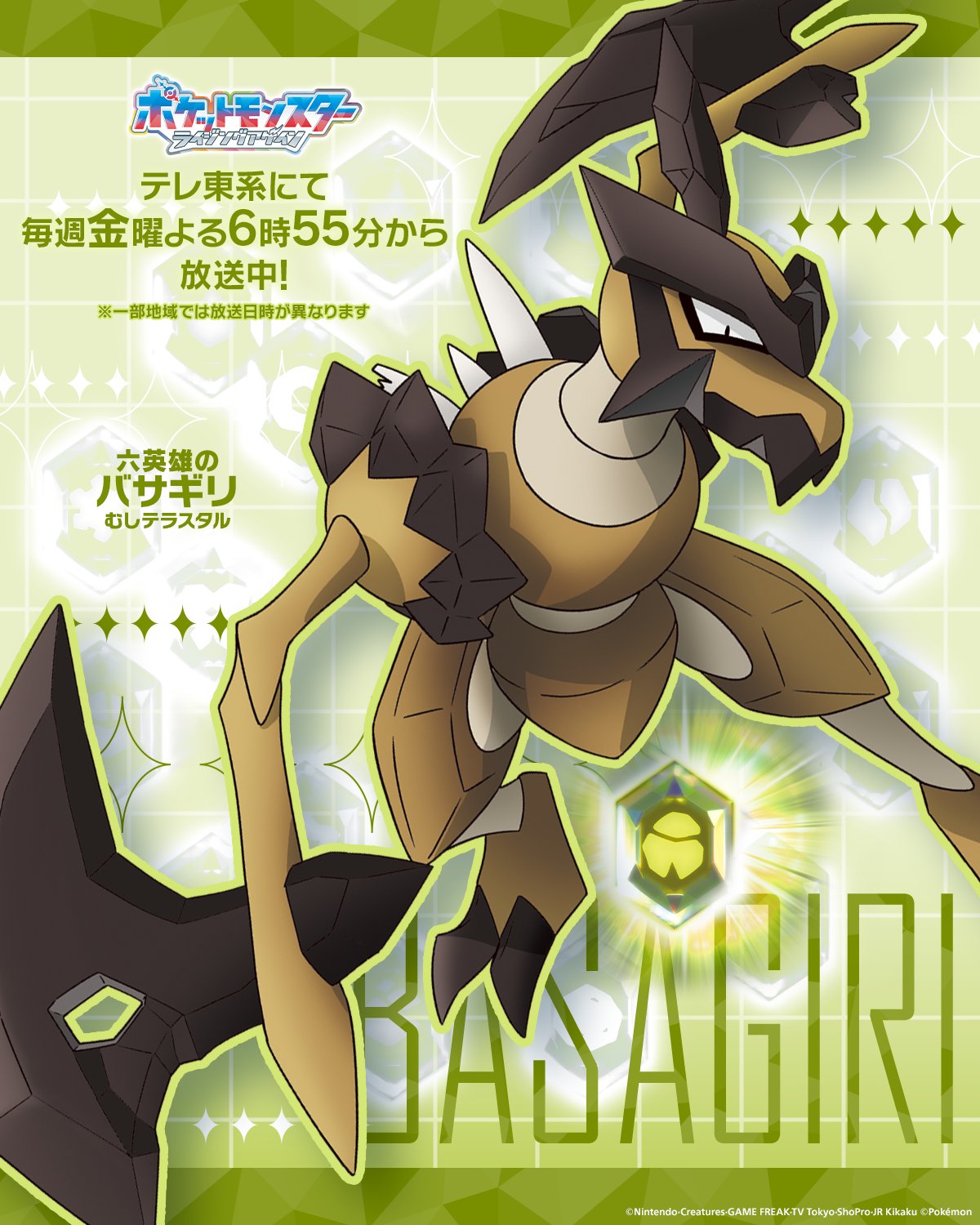 https://x.com/anipoke_PR/status/2042165638878392617>"Now then, off to the final battle!">Presenting the 18 Teras Type Pokémon and their strong Trainers that have gathered in order to fully eradicate the Rakulium:>No. 15, The Bug Teras Type>BASAGIRI FROM THE SIX HEROES