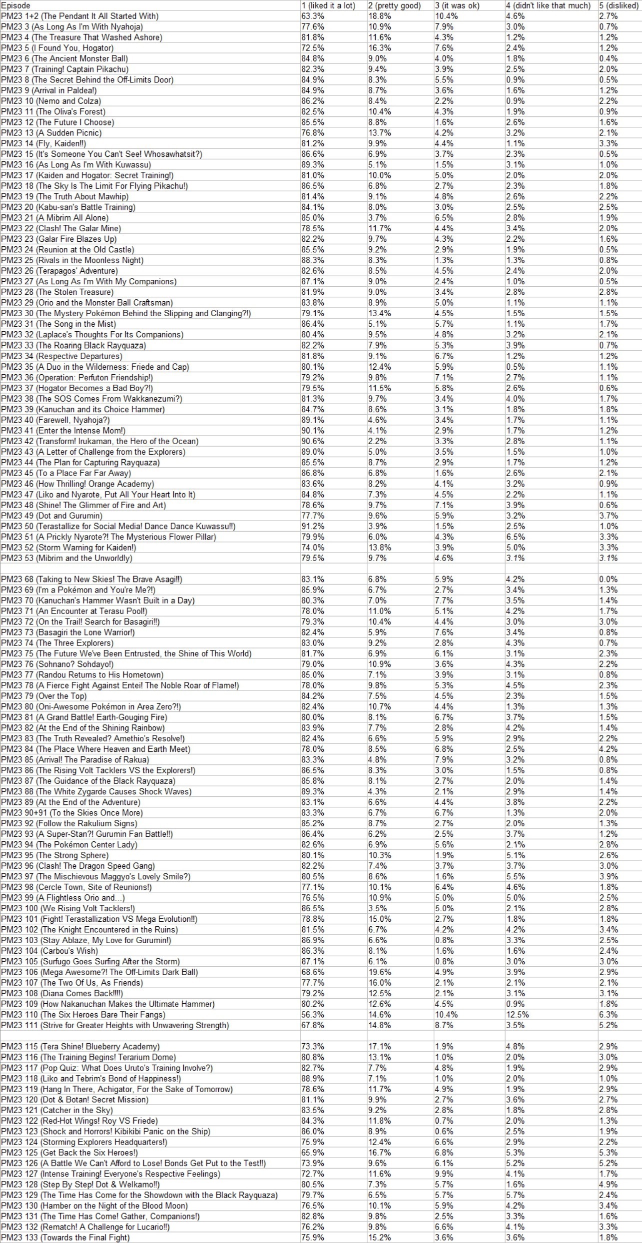 Animedia:>April 10th: PM2023 133 - Towards the Final Fight>The operation meant to fully eradicate the Rakulium finally begins! The group splits into two and heads towards the central parts of Rakua, but as Liko and the others make their way through the forest, Rubella and Indi appear before them and send out Desukarn and Deathbarn that have been strengthened with Strong Spheres! Dot, Nemo and Botan stay behind to battle, letting Liko continue onward, but...?!>Screenplay 松澤くれは (Kureha Matsuzawa)>Storyboard 清島ゆうこ (Yūko Kiyoshima)>Episode Director 藤野陽介 (Yōsuke Fujino)>Animation Director 仲金 (Jin Zhong)>April 17th: PM2023 134 - The Ultimate Showdown! Mega Evolution!!>April 24th: PM2023 135 - Awakening! The Rakulium Core of Doom>May 1st: TBA>May 8th: TBA