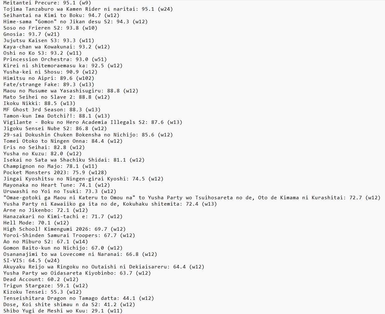 >>287367592Character ranking from the newest issue of Animedia:>1) Kurt (Milky Subway)>2) Nyanko-sensei>3) Max (Milky Subway)>4) Anya Forger>5) Maomao>6) Cure Arcane Shadow>7) Tsukasa Akeuraji>8) Yor Forger>9) Hansuke Doi>10) Izuku Midoriya>11) Cure Answer>12) Satoru Gojo>13) Katsuki Bakugo>14) Lu Guang (Link Click)>15) Inori Yuitsuka>16) Cure Mystic>17) Saitama>18) Yachiyo Runami>19) Haruka Sakura>20) Jinshi>21) Cure Idol>22) Oguri Cap>23) Frieren>24) Tamon Fukuhara>25) Kaguya (Chou Kagya-hime)>26) Husk (Hazbin Hotel)>27) Shiki Ichinose>28) Shoto Todoroki>29) Cheng Xiaoshi (Link Click)>30) Hikaru Kamisaki