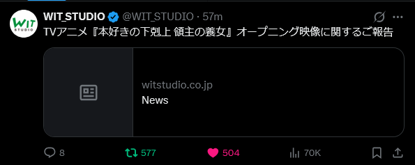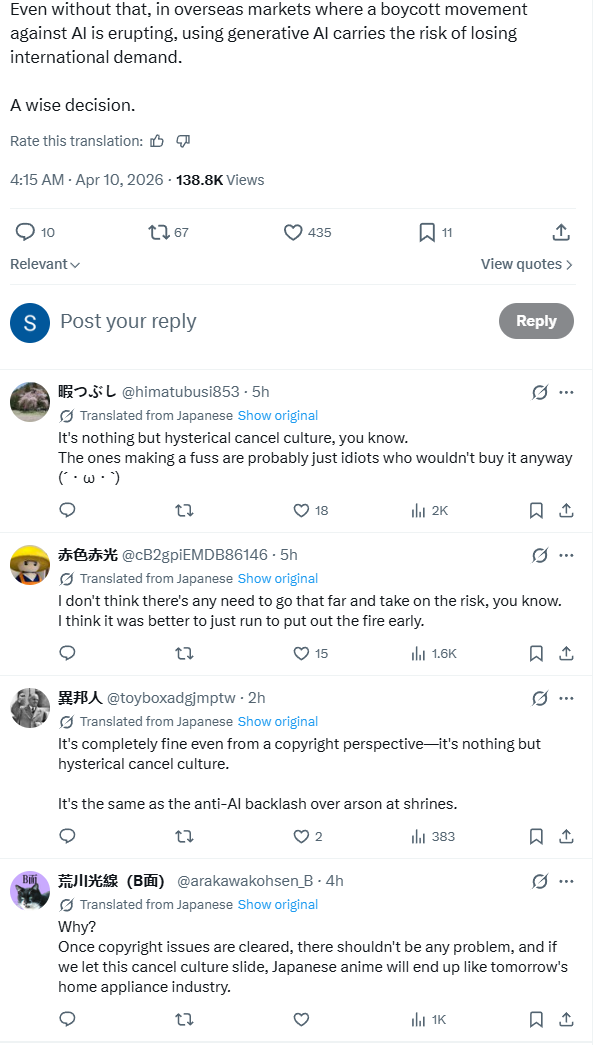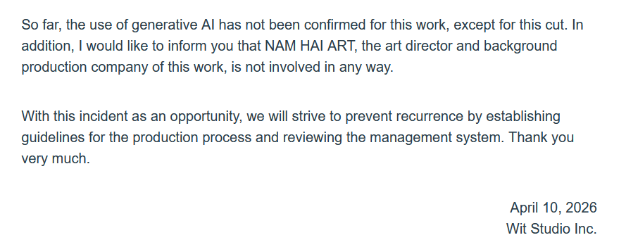 >>287369036We conducted an investigation into the production process of this work, including the opening sequence, based on the feedback we received after April 4, 2026. As a result, we confirmed that a generation AI was used in the production process of some cuts in the opening sequence.Confirmed factsIn the production process of the background art for a portion of the opening sequence of the first episode of this work (hereinafter referred to as "this cut"), a generation AI was used to create the materials.Future actionsWe will take the following measures. Redrawing processThe background art for this shot will be redrawn. Replacing the video with the final versionStarting with episode 2, the opening sequence will be replaced with the completed version using the aforementioned background art materials.othersWhile we at our company are always interested in and closely monitor new technologies related to video production, we have, in principle (*), not permitted the use of generative AI in the video production of our works, including this one. Despite this, the current situation has occurred solely due to shortcomings in our production management and inspection systems, and we take full responsibility for this series of events. As the production company of this work, we sincerely apologize to our fans, the original author, and all other related parties.To date, with the exception of this particular cut, no use of AI-generated images has been confirmed in this work. Furthermore, we would like to add that NAM HAI ART, the art director and background production company for this work, has no involvement whatsoever in the above-mentioned matters.Taking this incident as an opportunity, we will strive to prevent recurrence by revising our production process guidelines and management system. Thank you for your understanding.April 10, 2026Wit Studio Co., Ltd.*As an exception, there is the experimental work "Dog and Boy,"