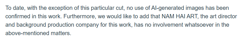 >>287369036>Blamed the mistake on a Vietnamese studio NAM HAI ART for the use of AI>Apologize dfor not checking the received background art from Nam Hai Art studio???????? No???? They literally said the complete opposite
