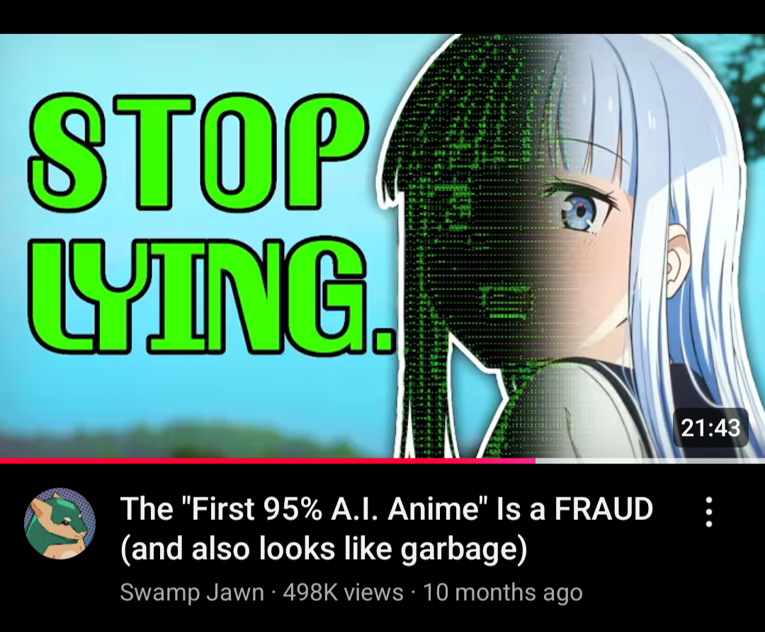 >>287369036I think the sad part is that even though there's pushback now, people will watch it anyway while complaining, and studios will keep doing it.See what happened with CGI.Webmrel would have been the laughingstock of the season in 2016. Remember Berserk 2016? Remember when it became clear all of Jojo would be adapted, the fear of CGI horses in SBR?But tourists who have no taste don't think CGI looks terrible, and they make up the majority, so the majority opinion is that PS2 cutscenes are "peak".Normalfags hate AI now because it's trendy, but they've shown time and time again that something looking like dogshit is not a dealbreaker.I guarantee that in 10 years, there will be an anime with heavy use of AI in the animation that will be considered "peak", or whatever the current buzzword will be in the future, by the general public.