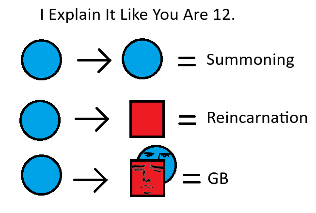 >>287373347the GB line implies red square is a different body and gender from blue circle, this creates issues with the reincarnation line because how the fuck are you interpreting that?it should've been blue circle -> blue square and then blue circle -> red square