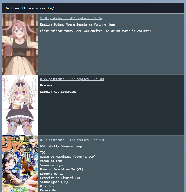 >>287381710>how do you decide what to watch?I look at the fastest threads on /a/