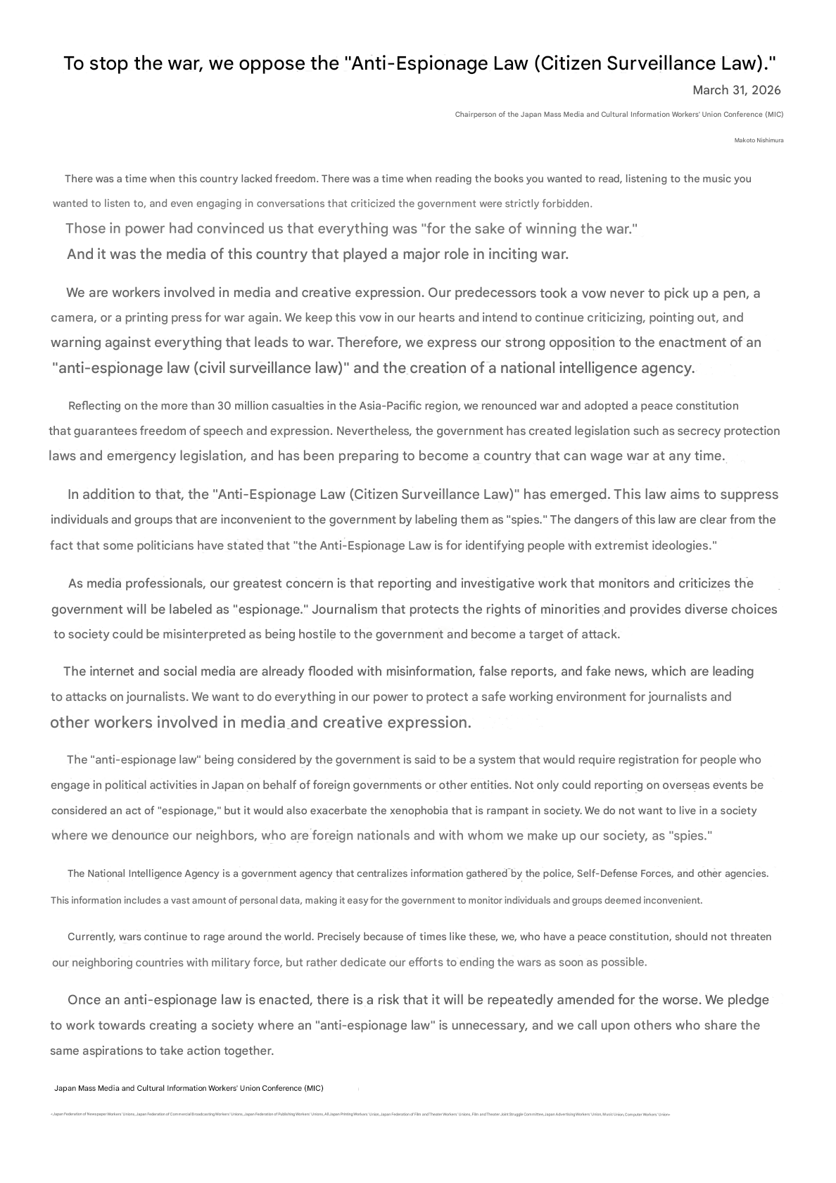 >>287382910>スパイ防止法Basic search keyword for your purposes. The intent is to create a Japanese CIA, with the focus turned inward and combine that with data sharing with the 5 Eyes countries. The justification is anti-espionage, but the enforcement is heavily directed inwards. The program is a revival of this 80s bill that didn't pass>https://ja.wikisource.org/wiki/国家秘密に係るスパイ行為等の防止に関する法律案Which is extremely broad regarding the government's ability to declare any information they don't want shared a 'State Secret' and the limitations on the enforcement methods are basically non-existent, only defined as 'not unduly infringing on human rights'. It also long had the backing of the Unification Church/Moonies - the cult that got Abe killed - as it played into their desire to get closer to America.