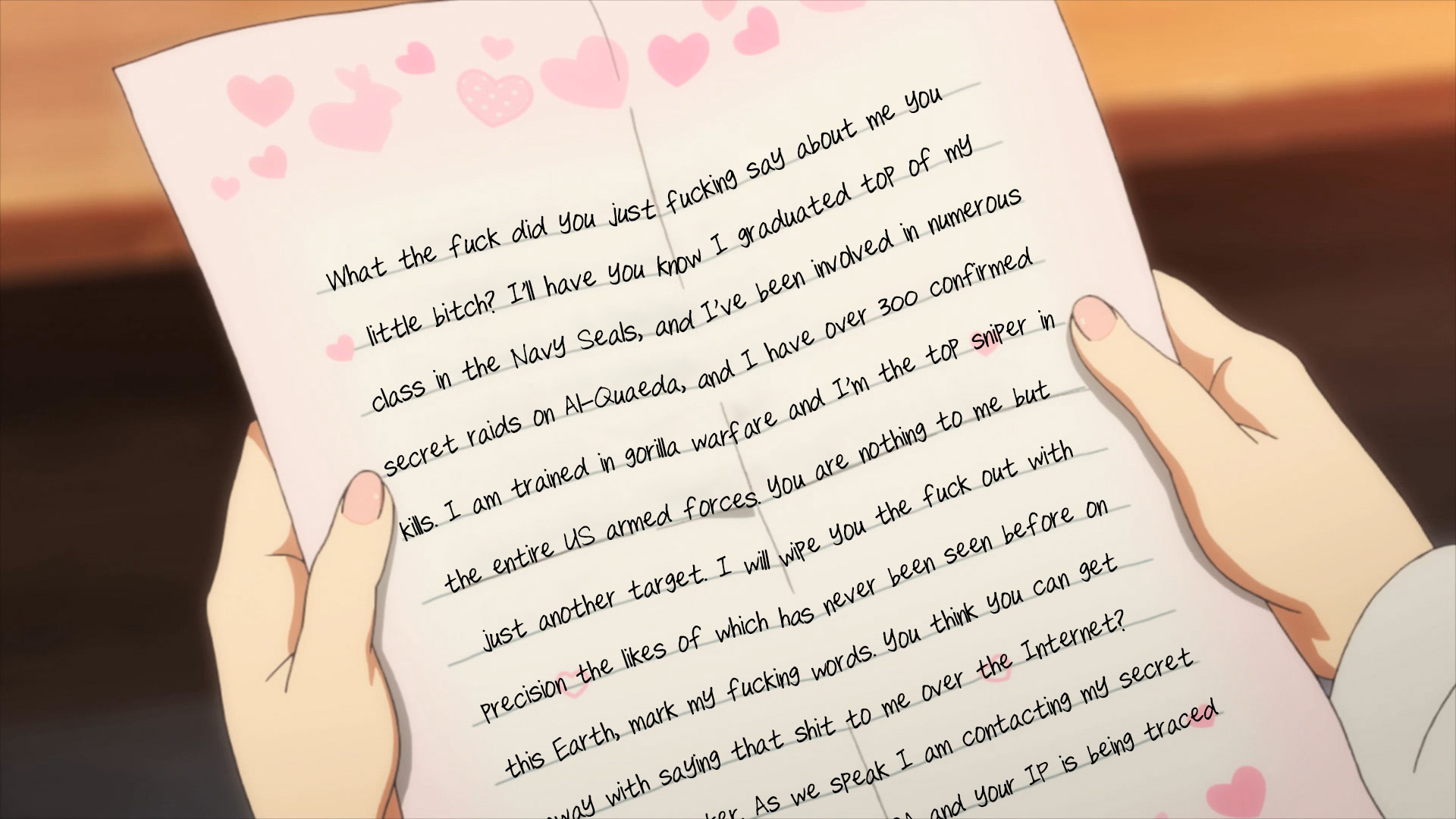 >>287381686he's obviously talking about the time slot he has to watch cgdctslop, the closest thing there will ever be to a girl posting in here is the sxarp cosplayer anon