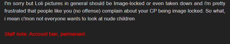 >>287397538>>287401551Oh wait, I misread this pic. I thought the message was from a mod who banned a guy for liking lolicon, but it was the other way around.
