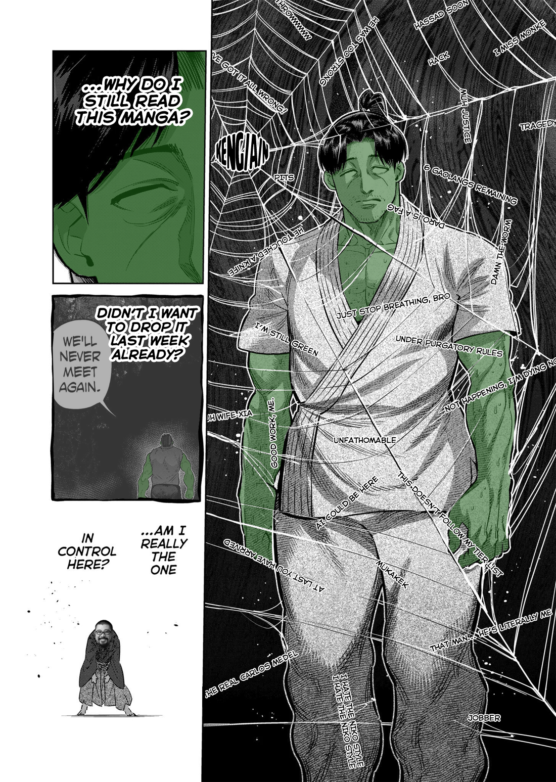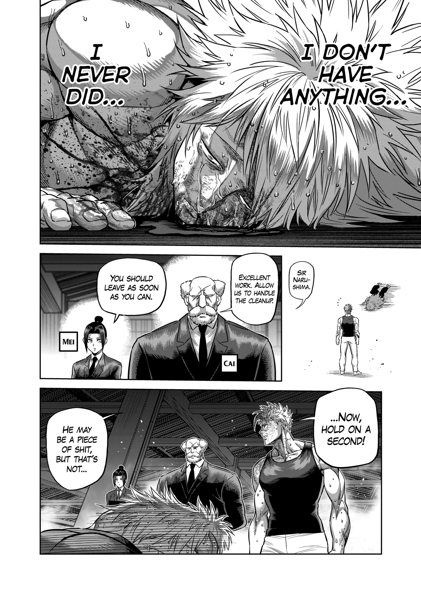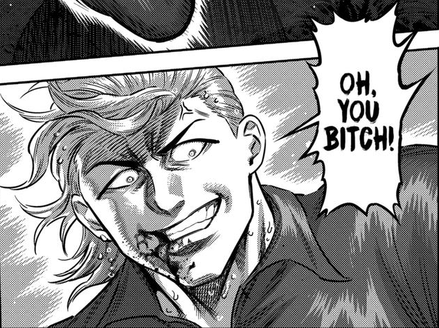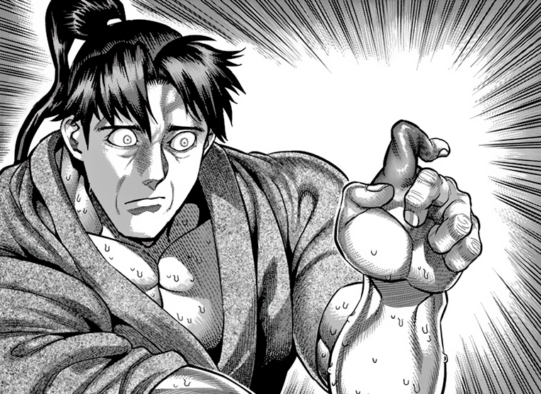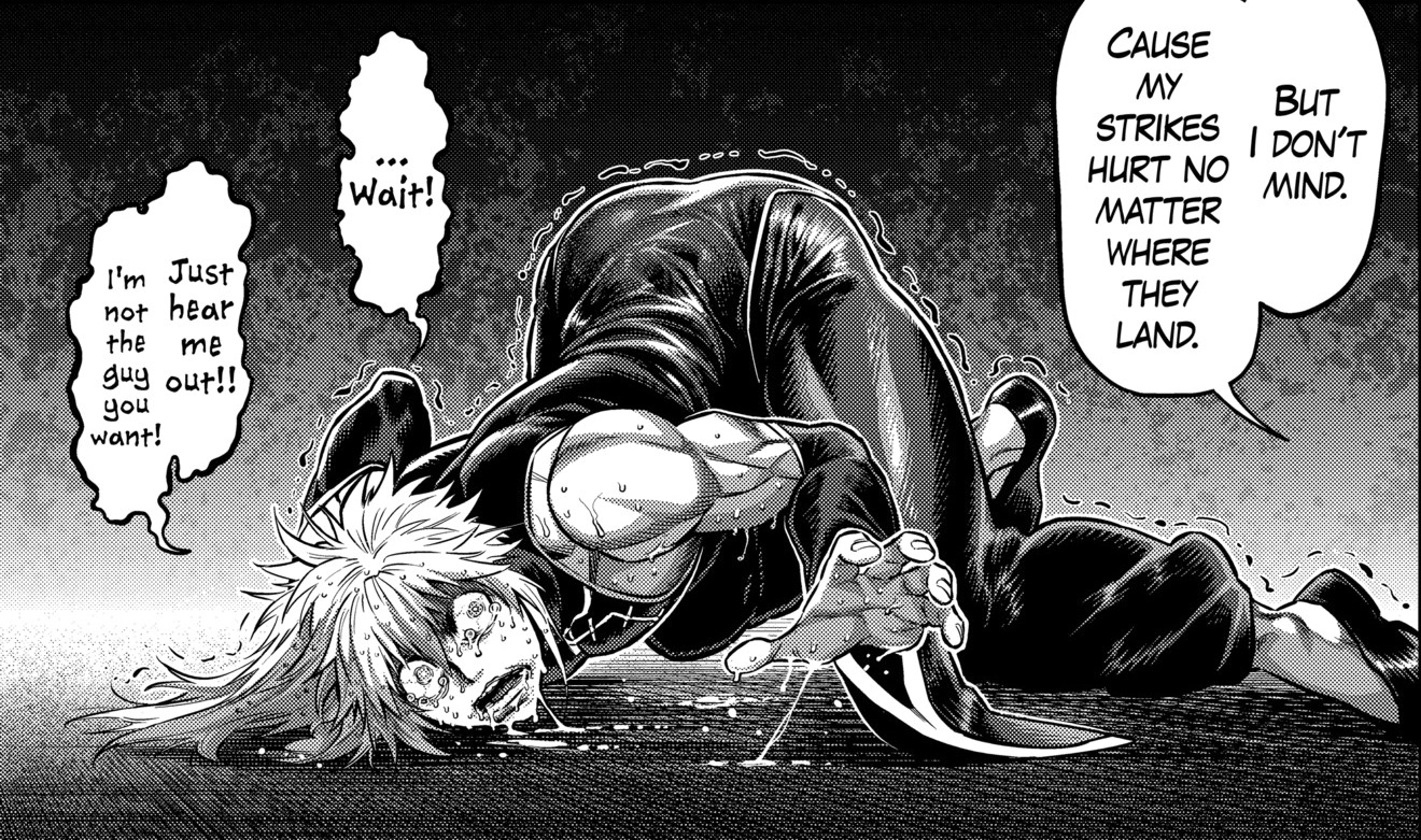 >>287405336These don't look like vital points to me.>>287405346>>287405352Honestly, I'm not really a fan of these impact panels. You can't see shit, and in the end it feels like time skipped a few seconds and the fighers end up in some new state. >>287405771Wow, he got absolutely bodied in this fight. The way the story set him up as a Fang-tier fighter I was expecting a close battle.>>287405808Nogi was really aura farming all along up until this point, only to bet it all on Hasumi and a half-dead Ohma. Not a good look.I already got spoiled ages ago on who will win the tournament, so I'm actually pretty confused how Nogi is going to become chairman.>>287405849Damage taken: ZERO