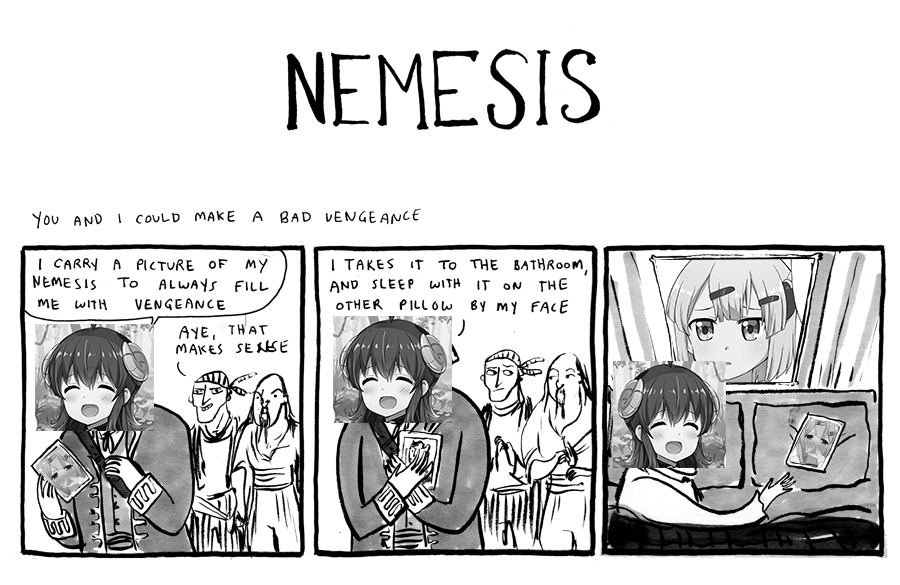 >>287409241No way, acting like a wife in front of your sworn enemy that you find pretty much flawless and flustering when you see her sleeping face is just common decency.