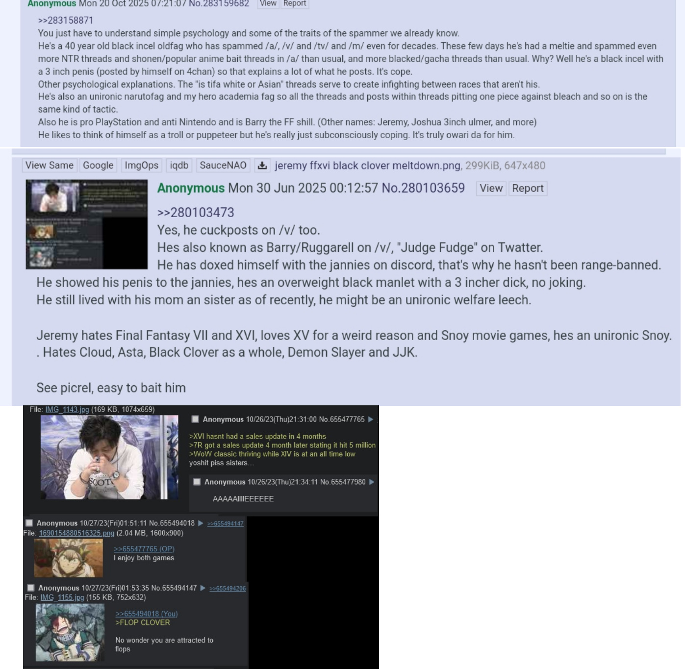 >>287412676He is a guy from /v/ constantly crying about some eric or final fantasy. He is a huge black clover fag/kgbfag