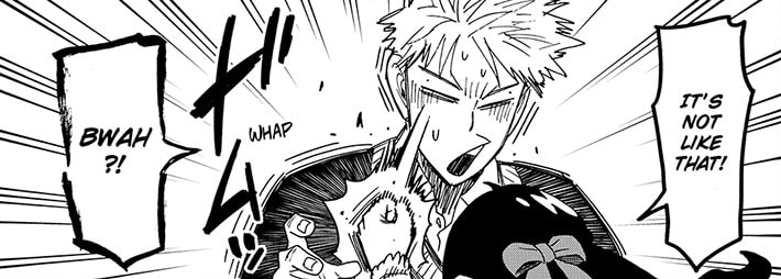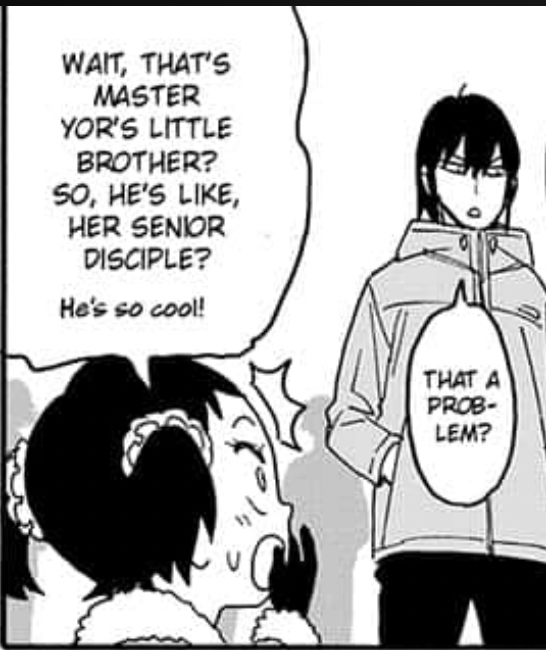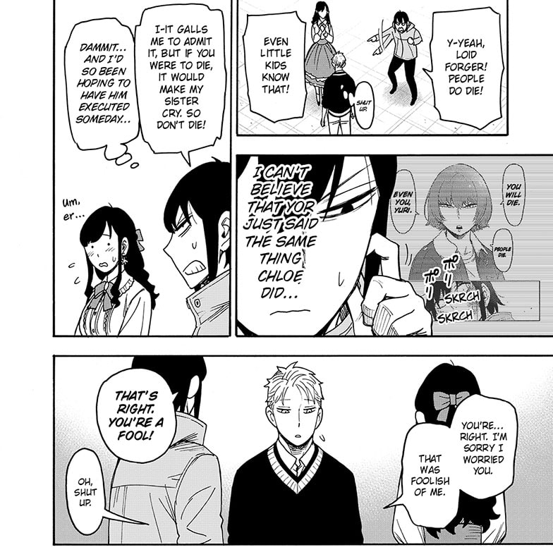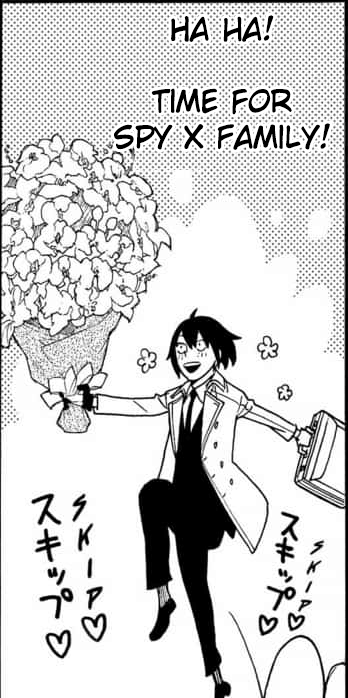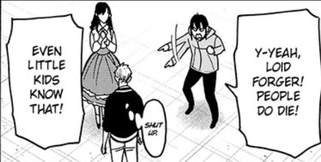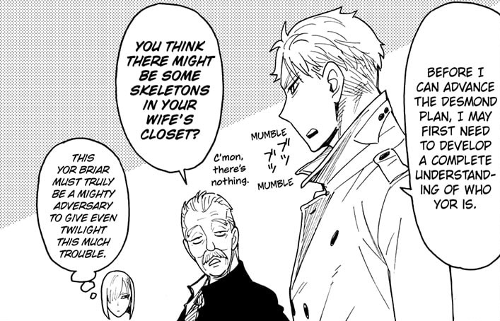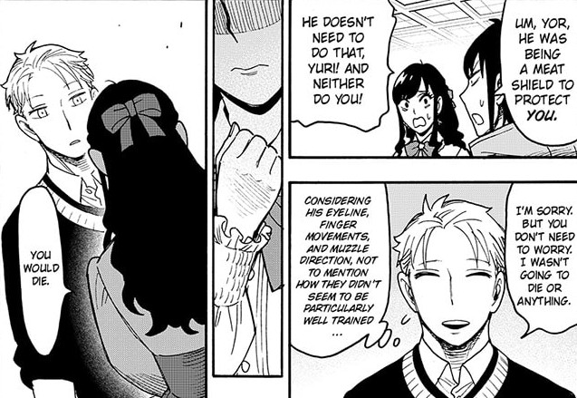 Between this panel, Yor grimly reminding Loid that people can suddenly and unexpectedly die, and Loid’s internal monologue about how a spy’s death is the worst case scenario because it can expose their organization, I wonder if this is Axeman foreshadowing himself killing somebody off. Not a member of the Forgers or Briars of course, no way Loid or Yor or Yuri will come to any real harm, but I wonder if Sylvia or Fiona might be on the chopping block.