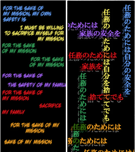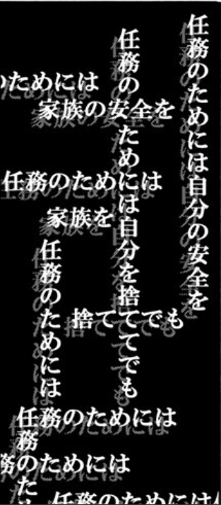 >>287421533>>287423138That's sort of how I'm taking it. The standard reading is vertical, which has his "correct" logic.>For the sake of my mission, my safety->For the sake of my mission, I'll sacrifice myself.>For the sake of my mission->For the sake of-But it keeps getting interrupted by the "incorrect" emotional horizontal reading.>For the sake of my mission, my family's safety->For the sake of my mission,>I'll abandon>my family.>For the sake of my mission->For the sake of my mission->For the sake of my mission-