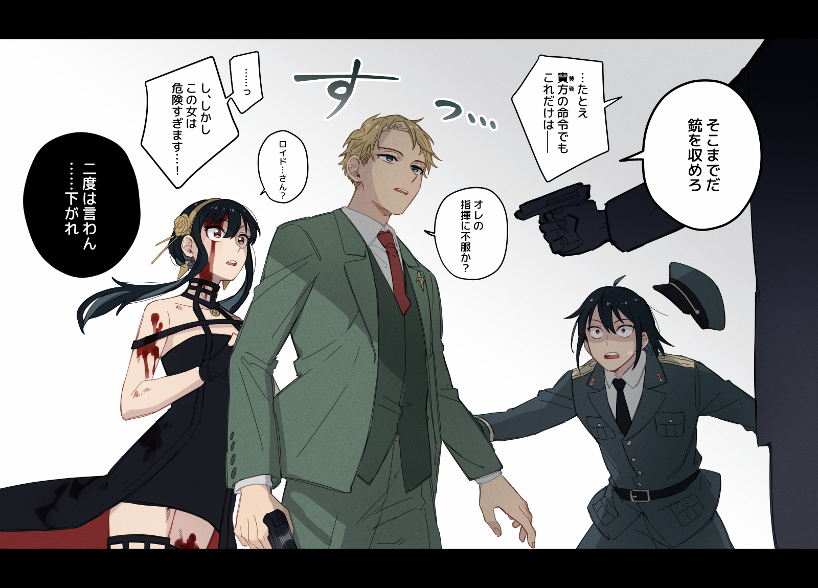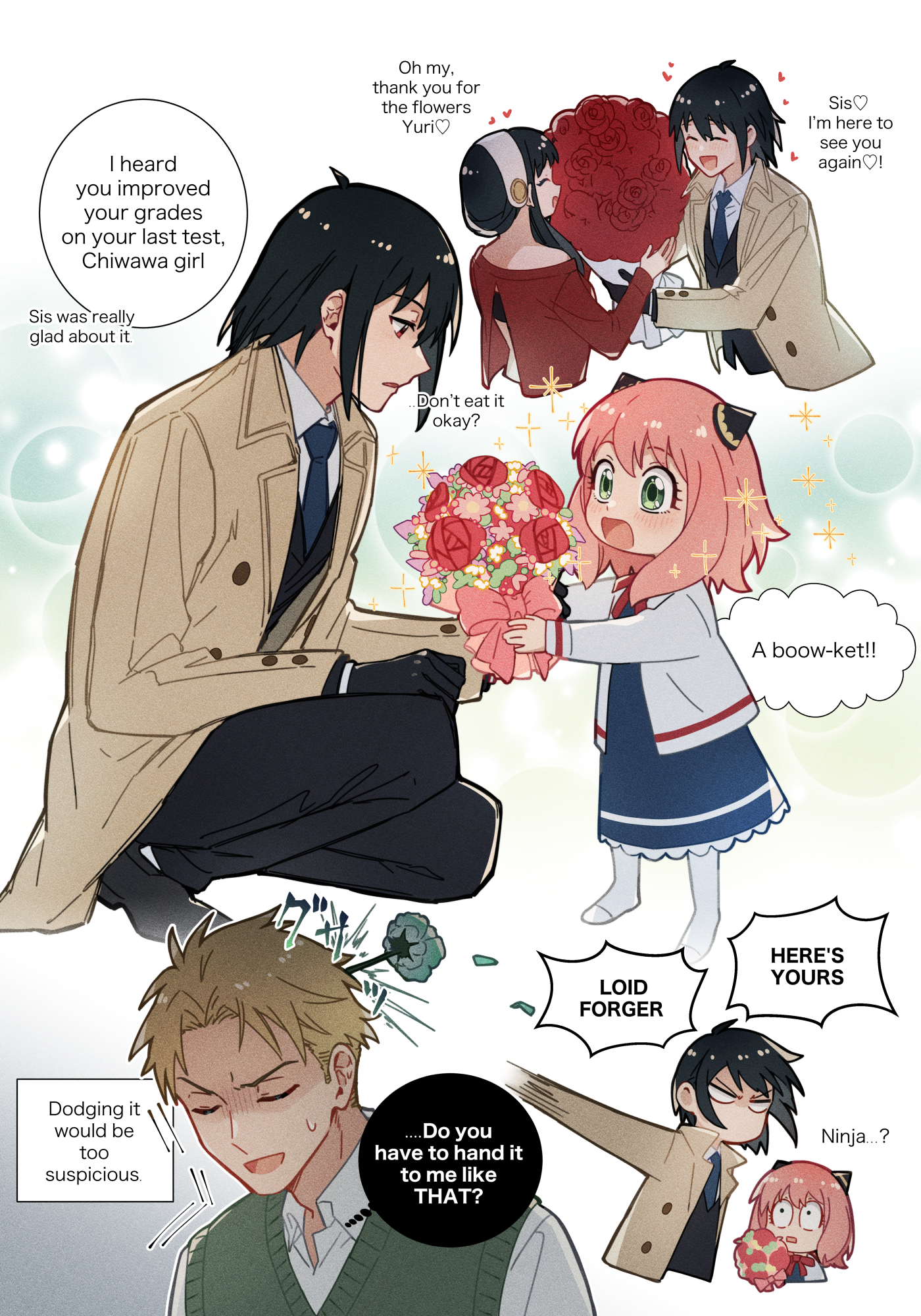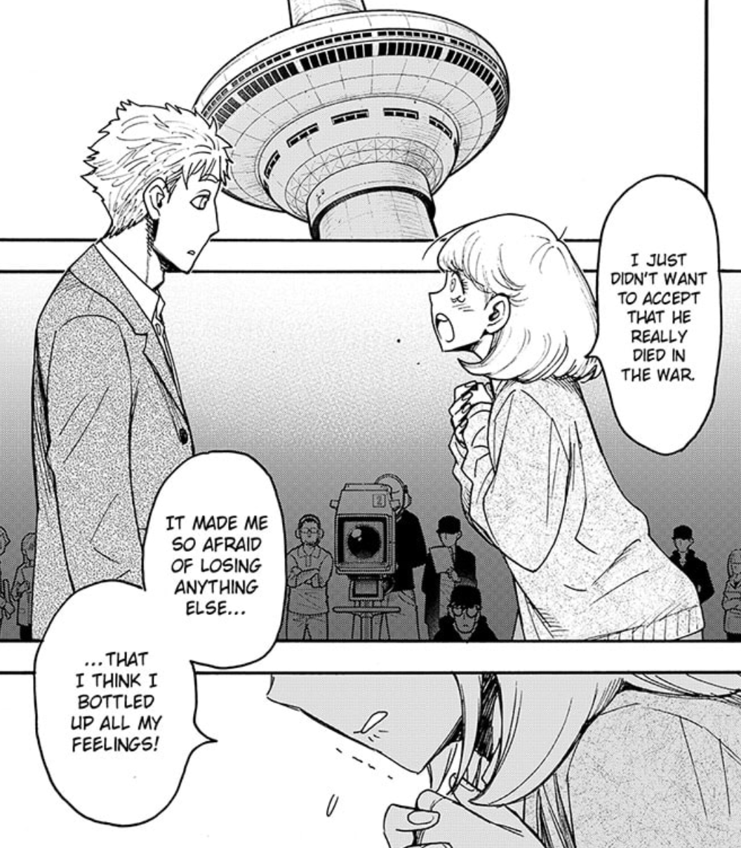 >>287420009Thank you for the dump.It was a really good mini-arc with visible progress for multiple people. Yuri accepting LoiLoi (and confirming that Chloe got into his thick skull), Yor becoming quite open with her feelings and her need to play a part" and Loid's "part" actually crumbling down as his emotions start to reappear.The absurdity of coming back home in military armoured vehicle makes a great background for the Yor/Loid thinking about their true vocation.