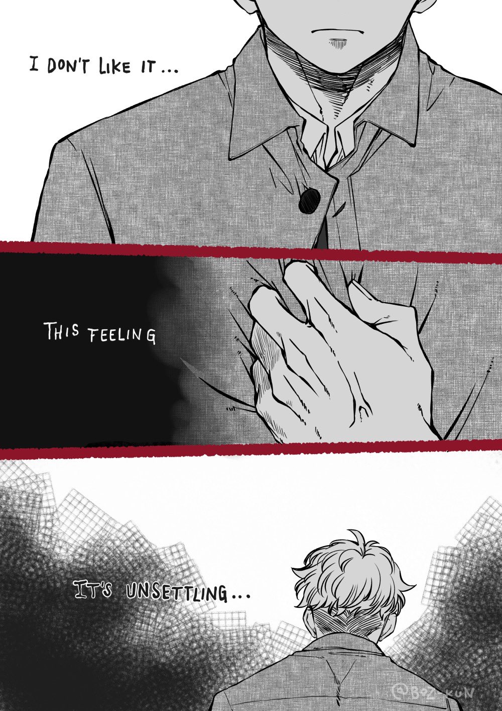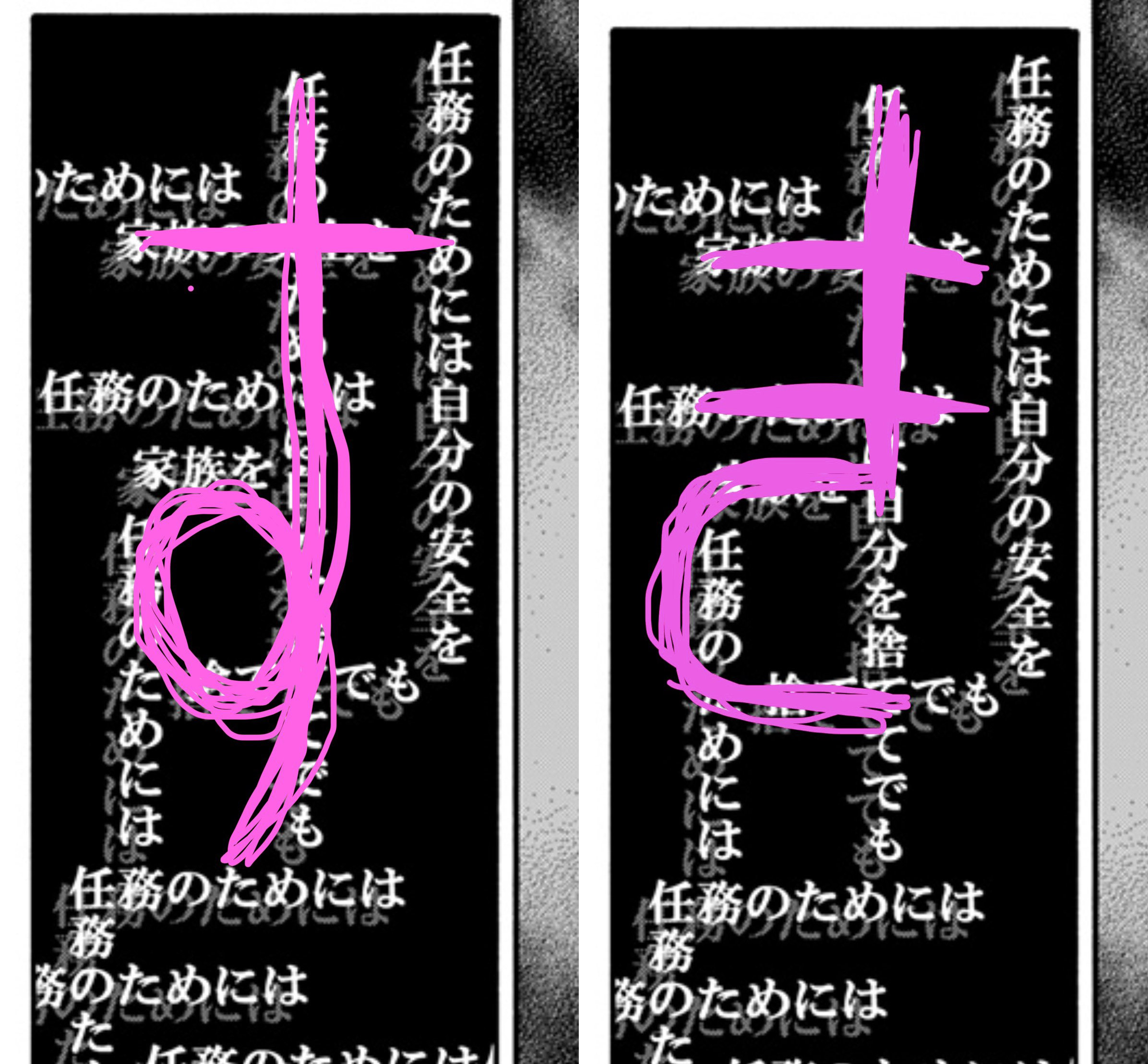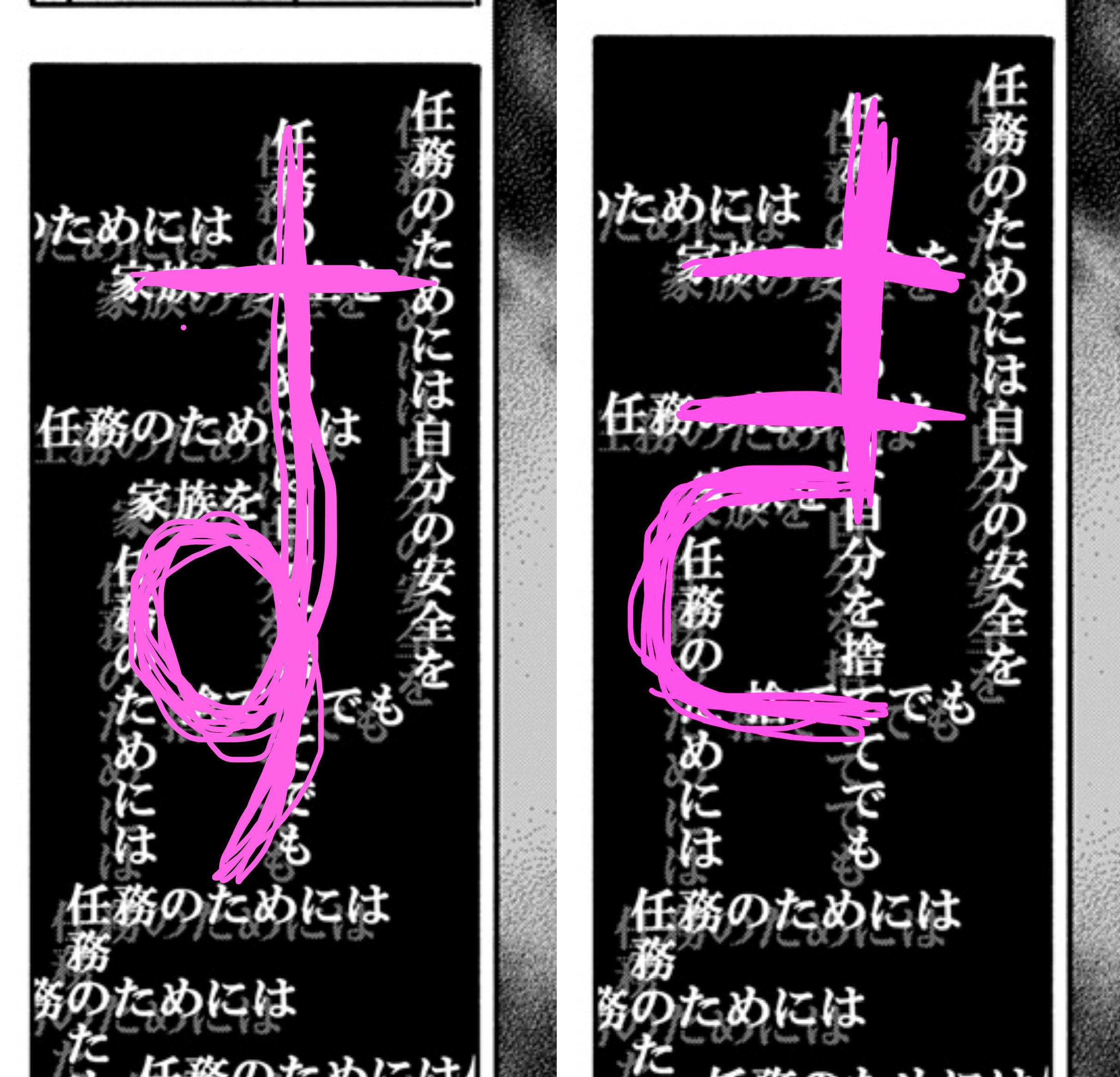 >>287439199Yeah, it could be rephrased. The vertical text is him thinking about himself (自分) while the horizontal text clashing with it is about his family (家族). Even though they used to overlap without issue on his mission, his priorities have shifted to where his safety is becoming less important than that of his family's, which caused him to start breaking down. It wasn't a problem before, but Yor made him realize how serious it's gotten.