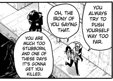 >>287438340>For the sake of my mission, I'll sacrifice myself.I would say this one isn't mission "correct." For the sake of his mission, he's supposed to NOT sacrifice himself. That was the whole point. He's supposed to sacrifice Yor, but he can't make himself accept that and so he keeps defaulting back to sacrificing himself.