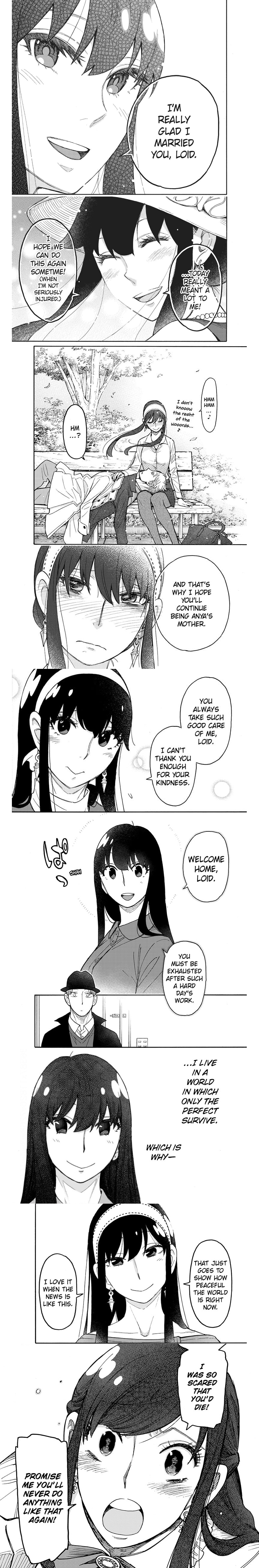As much as I want to see a definitive confirmation that Yor decides that she's unworthy of Loid's/Anya's love while Loid realises his feelings and tries to kill said feelings before he witnesses another tragedy like in the childhood, I just want a chapter or two for their another date where they can just feel that "it's alright for this one last night" and have fun together.Without alcohol and without Twilight. Just Yor and [Redacted]. I don't even need a kiss (which would be much appreciated), but maybe coming home tired and falling asleep on the couch while hugging each other would be enough for me. Both of them are much closer to each other than they realise, and such hug would show how they unconsciously deeply trust each other enough to expose their weaknesses (falling asleep) to each other. Such falling asleep would show how those two orphans, full of mistrust for other people, ready to kill at the drop of a hat can find a safe haven in each others arms.
