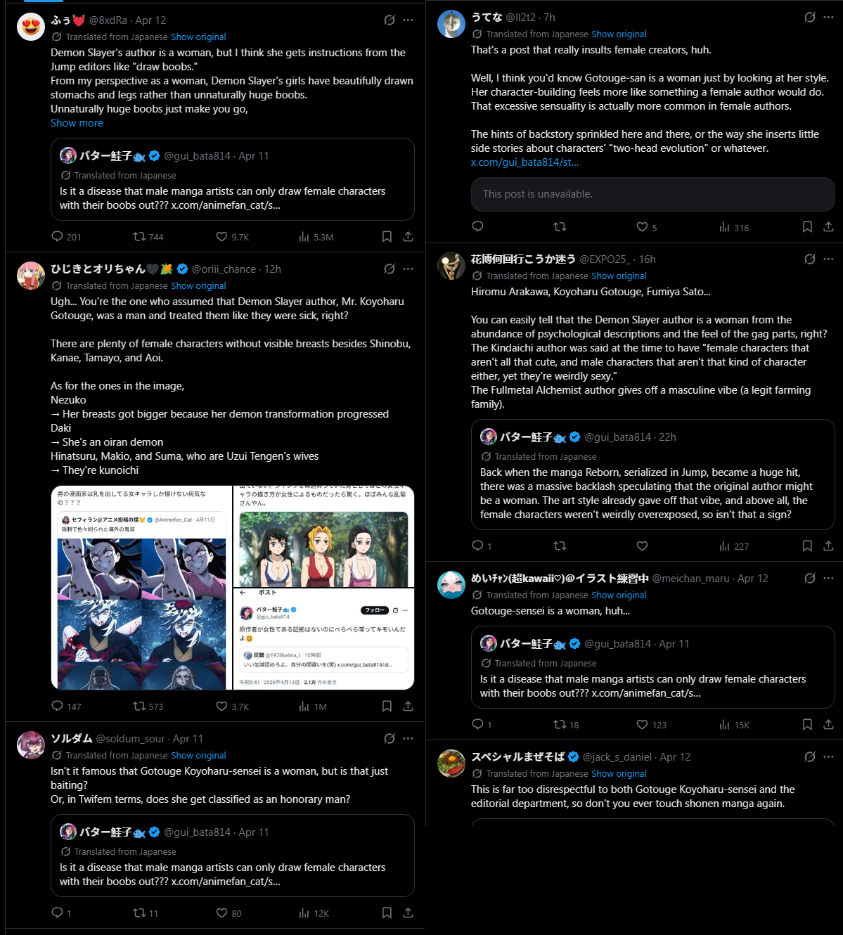 >>287448578>Not her, but you have literally no evidence that the author of KnY is a woman. Wrong. This was already a settled debate. They identify as a future-woman but they don't feel comfortable with female pronouns yet and they don't want to show their face in public either, logically. As such, it was officially concluded in the intellectual Kimetsu fandom on Reddit that they should be referred to as they/them. Hopefully, they will be able to afford the transition op after the final KnY movie.
