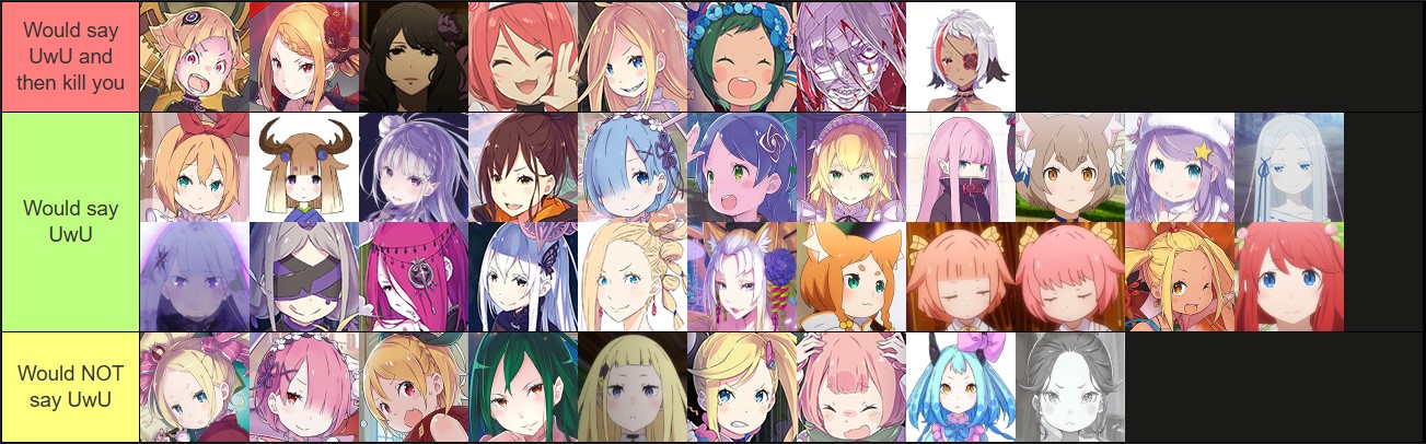 >Mimi: I love Garf>Garfiel: I love Ram>Ram: I love Roswaal>Roswaal: I love Echidna>Echidna: It's not you, it'm just not ready to settle down after only 400 years, i hope we can stay best friends though.