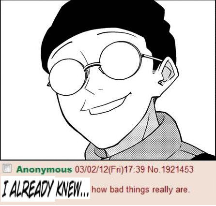 >>287461053There's no unifying belief or even circumstances among hikikomori.I'm not sure if it's a nitpick, but Satou isn't even an actual hikikomori for the most of the show, his alleged dysfunction is a lack of job and exaggerated hedonism. For all that matters, he was pretty normal. I'm not 100% sure if I remember right, but the conspiracy stuff wasn't even something Satou was truly into, it was more of a remnant, a ghost from his past relationship with the Hitomi-sempai.