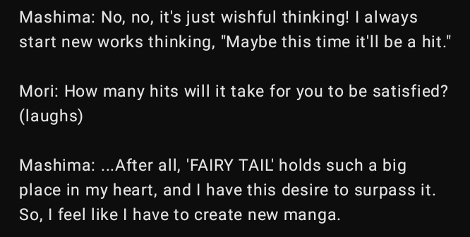 mashima is so weird... he does these virtual fan sessions, goes to conventions, takes pictures with cosplayers and caters to them, yet the manga feels like he absolutely despises fans. i don't think he even has a notion of how this would play out in a volume and strictly adheres to the series being read through a (virtual) magazine exclusively.