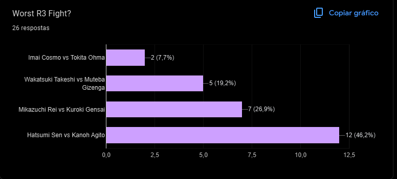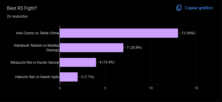 >>287484280>but the attempts at a scientific explanation just highlight how this is basically impossible.It's the Niko style. I don't gotta explain shit>>287470987>>287471002I missed the poll but I'm surprised that Rei vs Gensai is that low. But also that Cosmo v Ohma is that high. Sen v Agito is also not what I think the worst R3 fight would look like but it is what it is for this storytime.
