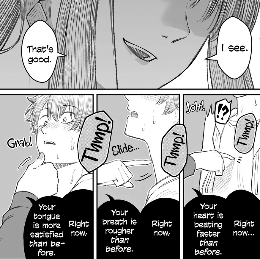 Guys I'm on chapter 5 and I don't think I can take much of when she uses the black speech bubbles. It feels like she's reaching from the page and stabbing me in the heart because I'm a dame ningen too. It's nice that she's sweet to him afterwards in her own way, but I'm weak. Can't she just make fun of MC's pp?