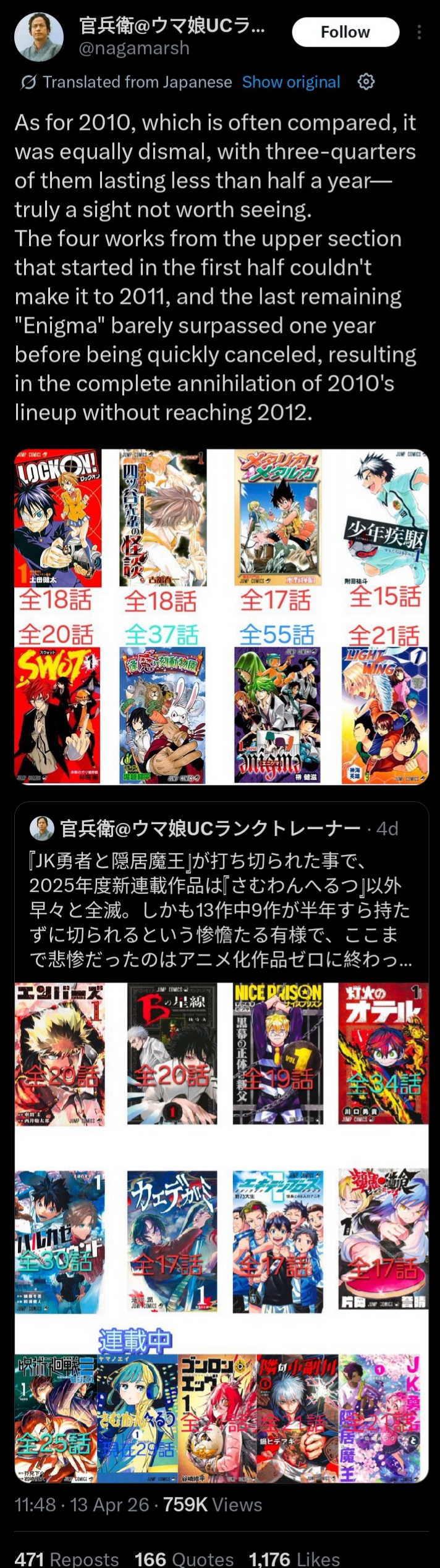 >>287510975>needs to select better Not possible while Oda has his power, and editorial has nothing to do with it except for listening to Oda. > guide mangakas betterMost of the manga axed in 2025-2026 was unsalvageable garbage, no kind of direction or guidance would ever save it.