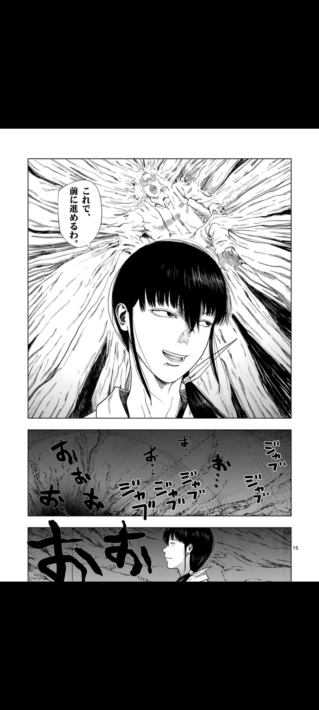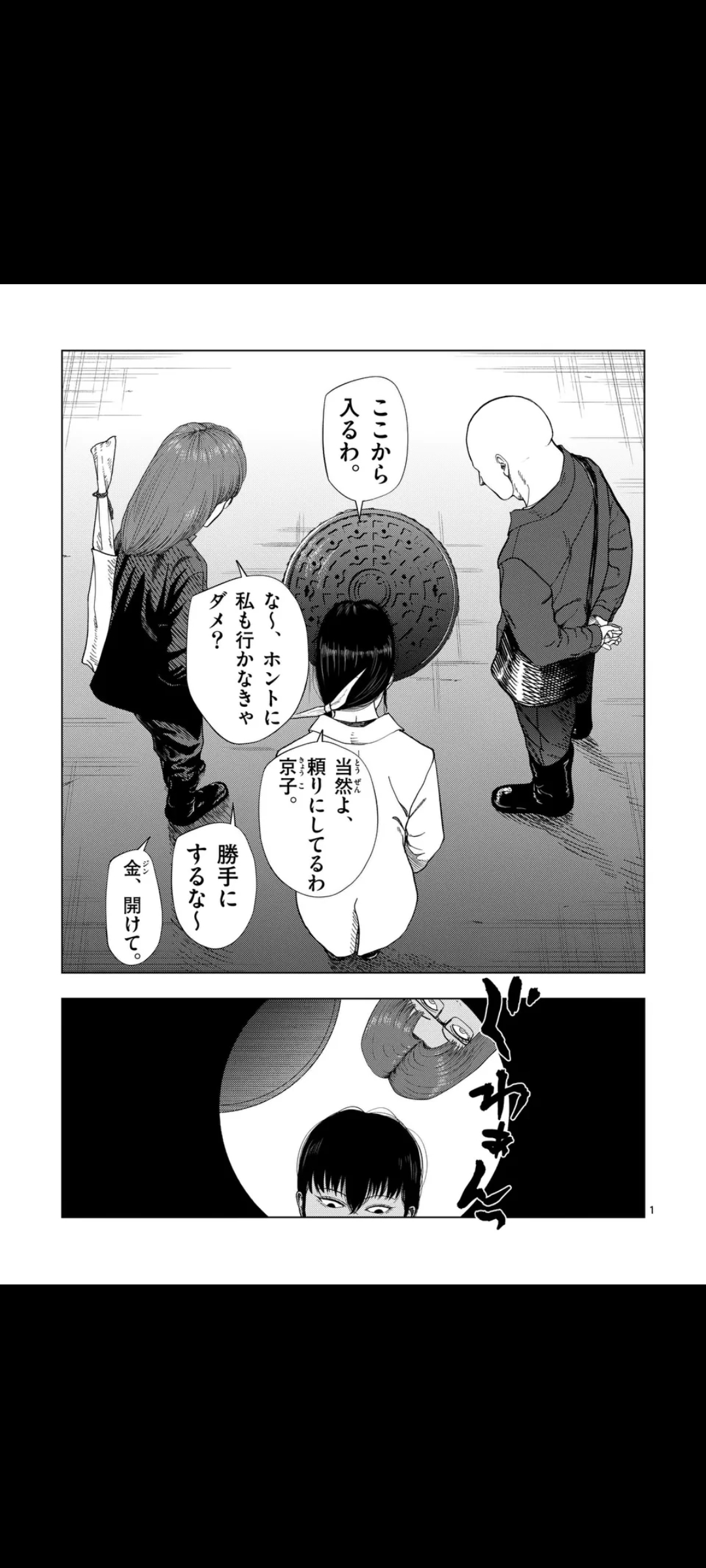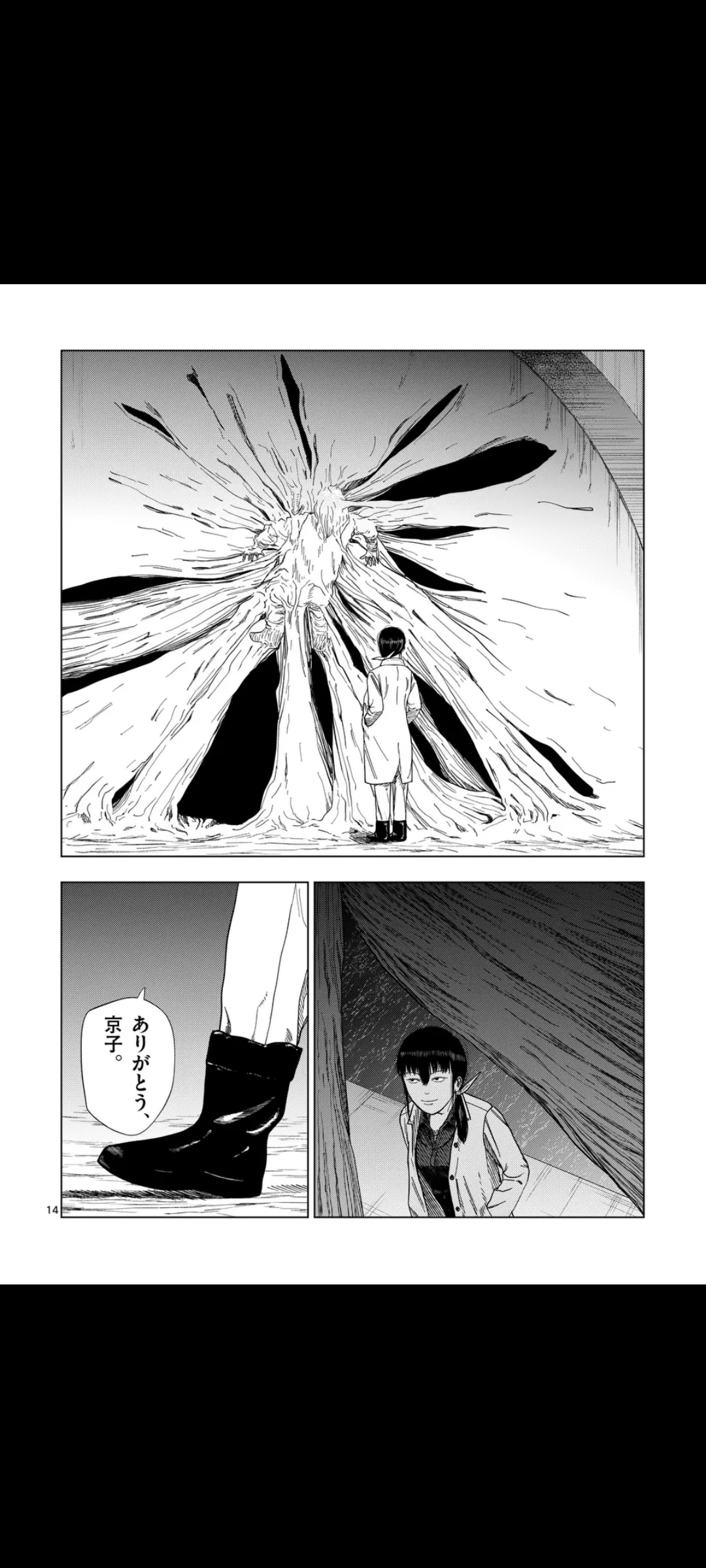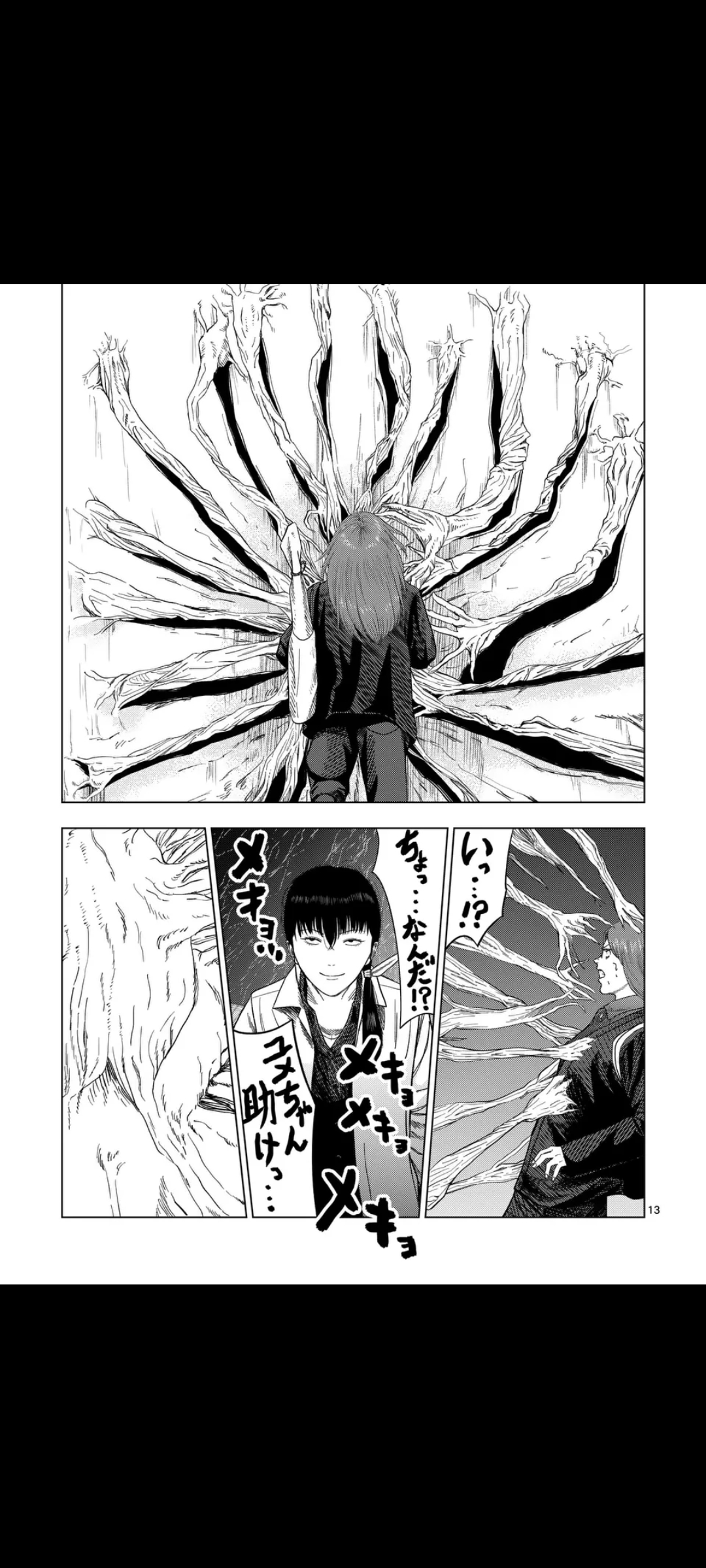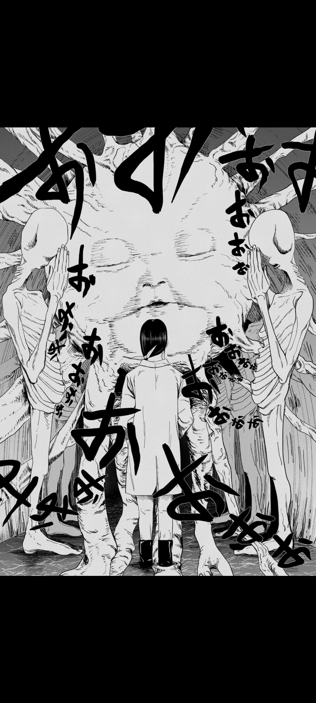That's when they reveal that the dead end was no dead end at all, but a wall of skin that snatches up Akagawa, creating enough space for Yume to "keep going forward".There, she finds a group of skinny humanoids worshipping a giant baby face.That's it for now. Next chapter next Friday.