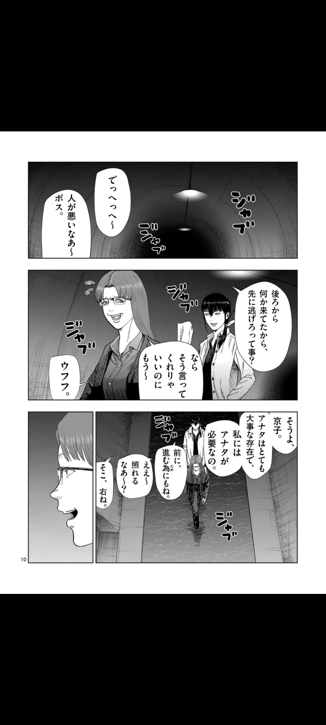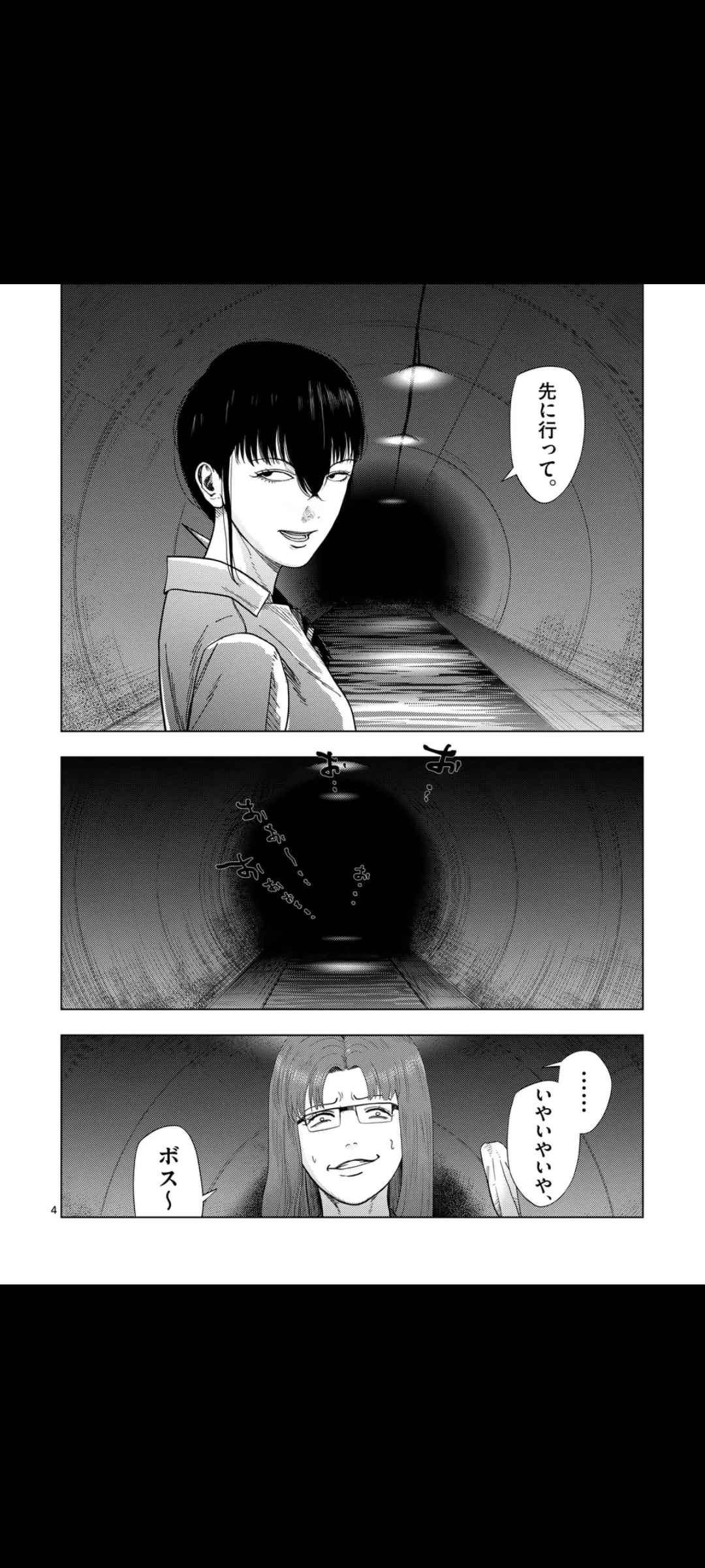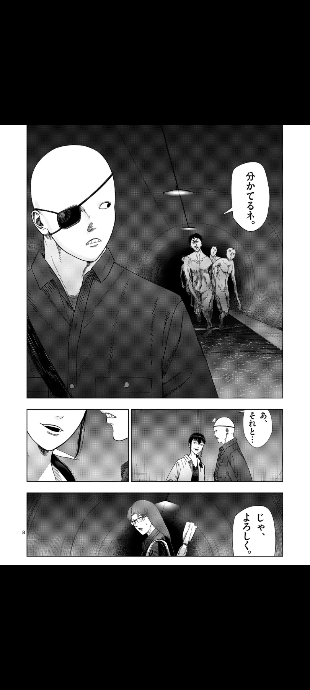Summary time.We begin with the three looking down at a sewer lid, Akagawa still complaining that she doesn't want to go, but she still goes down anyway. In the spacious sewers, Akagawa calls to Jin, who she recognizes as an acquaintance of her younger brother, Takuma Yagi. She asks him how things became this way, why does it feel like he's taking orders from Yume.He replies that he's not taking orders from her, just watching her until the end.Yume interrupts before he can explain further, teling Akagawa to go on ahead, but she refuses, saying she's just a worthless desk jockey who can't do anything in the frontlines, but Yume doesn't care. Enraged, Akagawa asks Yume what she did to her to deserve this.Yume begins listing her sins: first, she makes all her recruitment fliers herself, so she always skims a bit of the real salary; she also lies about having exclusivity for certain jobs so people won't look them up in other brokerage places; she took money from Kuroiwa under the guise of rent; asked for a fee even when they met with clients directly; increased publication fees for clients while advertising Yume and Hama without giving them any returns; sold photos of them to strange fans of theirs; and also never paid back the money she gave her for coffee.Of course, she forgives her for all that, so she'd better go on ahead. Akagawa obliges. At the same time, she tells Jun to deal with the things behind them. She tells him something more, but we don't hear it.Yume follows behind Akagawa, telling her that she wanted her to go on ahead so she wouldn't get hurt by those things. She's a very important, very necessary person to Yume, so she can keep going forward. She then tells Akagawa to go right, only for them to come across a dead end.Back to Jin, he finds out that those things we just sewage wearing human skin, so weak in fact that any regular human being could deal with them. But he gets the feeling something much worse is hiding somewhere nearby.