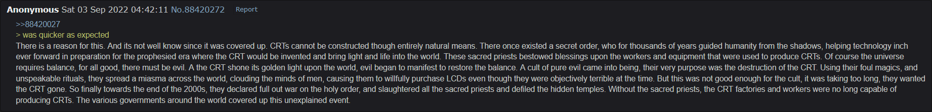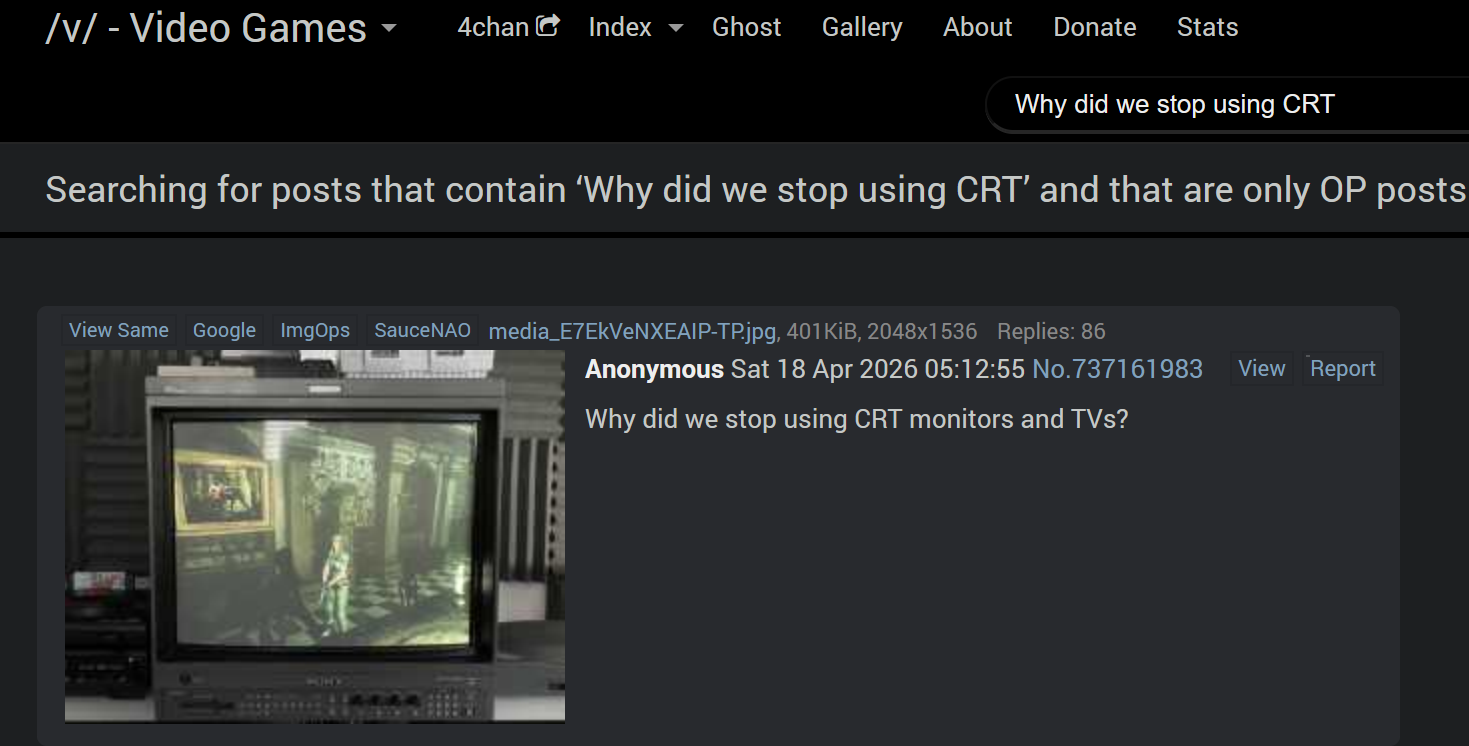 >>287532451Because CRTs are shit and inferior to electronic displays in all but a few specific cases.