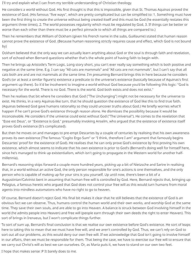 If you really wanted to get /pol/ about it, you could also clip this entire scene as an explanation as to why main-line Christianity is the only religious doctrine that is compatible with modern day; it's the only doctrine that has essentially reasoned itself to the point of being okay with a lack of God. For all it's failings throughout history, Christianity was flexible enough to allow the freedom of thought... sometimes.