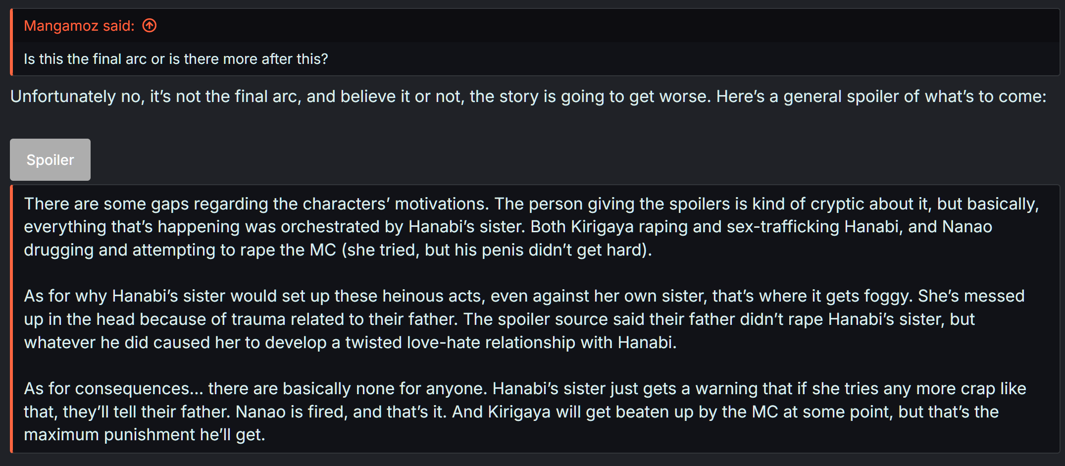 first of all, fair point. but secondly, this was presented and promoted as a work of erotica for mature audiences from the beginning, and the level of sexual assault in this gets to comical levels. the manga in OP started as a high school romance drama moving on from childhood trauma type of story, the shift to sexual assault, prostitution and misery porn happened practically out of nowhere on Chapter 46 onward.