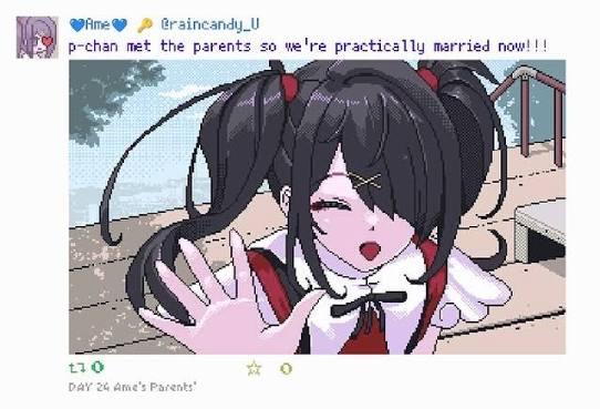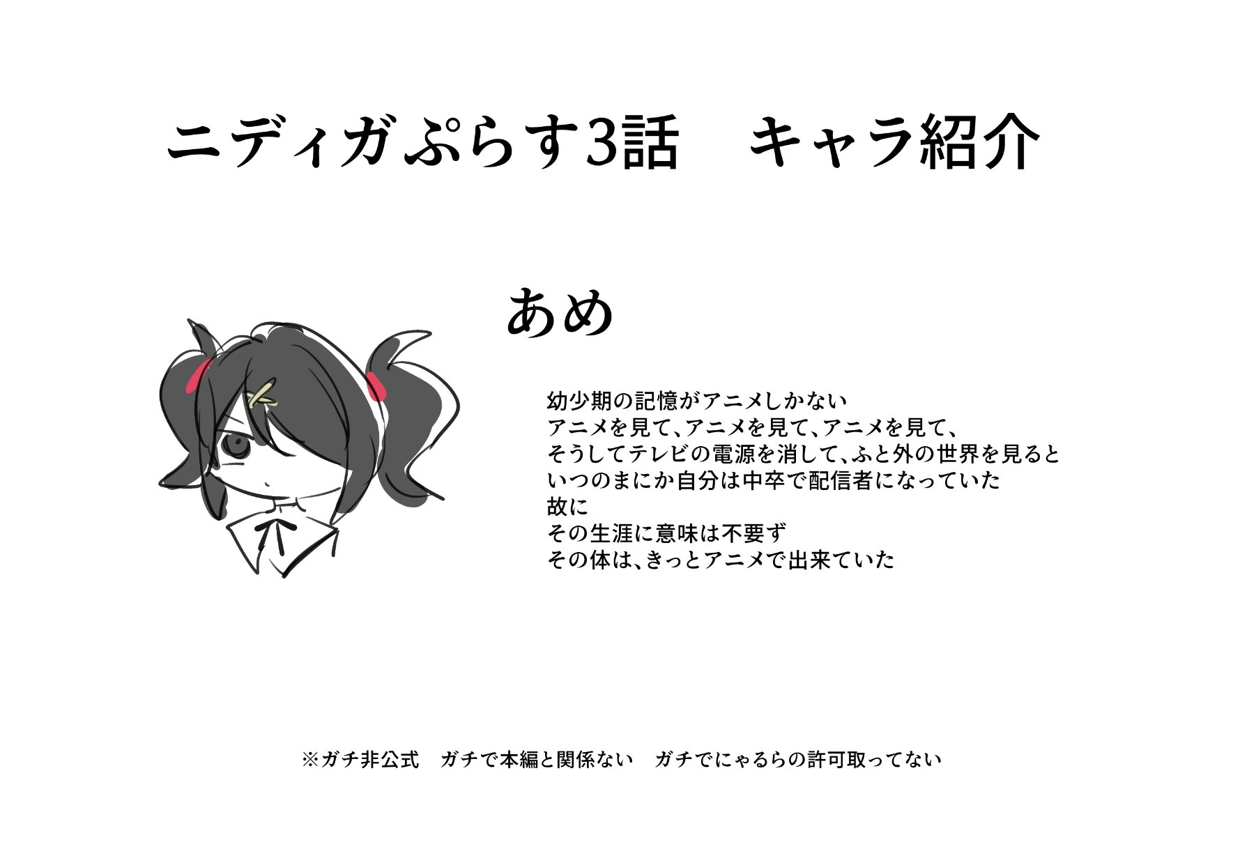 >>287580079Ame is based on a mix of his ex-girlfriends, probably some anime characters, and himselfOne of the anime staff joked about how they'd read the script nyalra sent them and realise it was basically the same as the schizo messages he would send while having a mentally ill episode