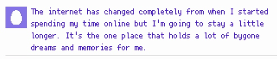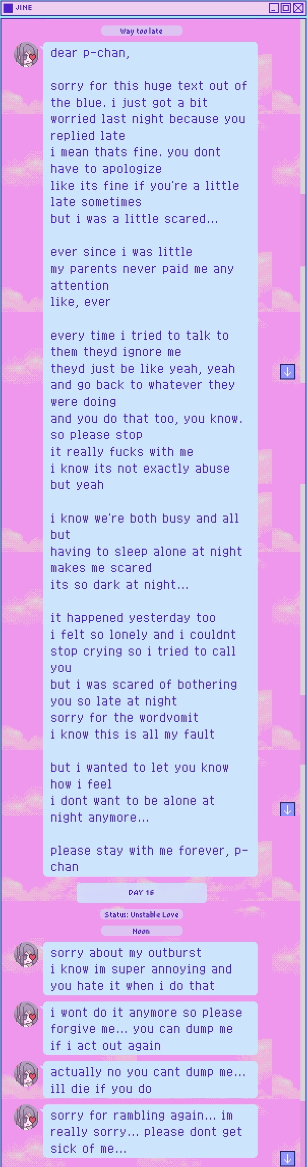 >>287570796From the game, the only parts she mentions to the audience is feeling lonely and that she turned to the internet for human connection due to her isolation, but she never really goes into detail.