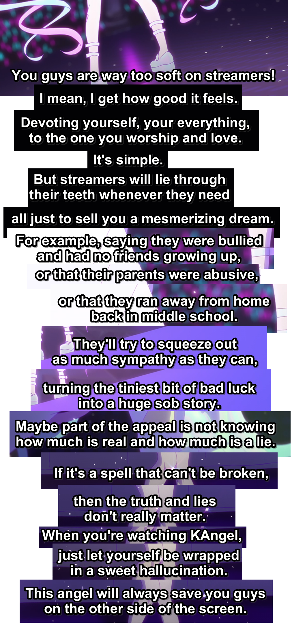 >>287576709It's not really. It's just banging you over the head that the personalities you share a parasocial relationship with have lives outside of that. Illnesses, relationships, hang-ups, doubts and ambitions and flaws. It dresses it up in a lot of pretty language but it's not making a value judgement. It just REALLY wants you to know that "This is happening, it's affecting people, they are all real and vulnerable people, and ignoring that, hating it, or lying about that won't change it." I wish it wasn't so fucking preachy about it, because I actually do like what it's doing, but like a good third of the runtime so far has been these long fart-sniffing monologues about it. The latest episode was the best so far, just because it kept the soap box to a minimum. Still had to sneak in an insulting little KAngel speech at the end though