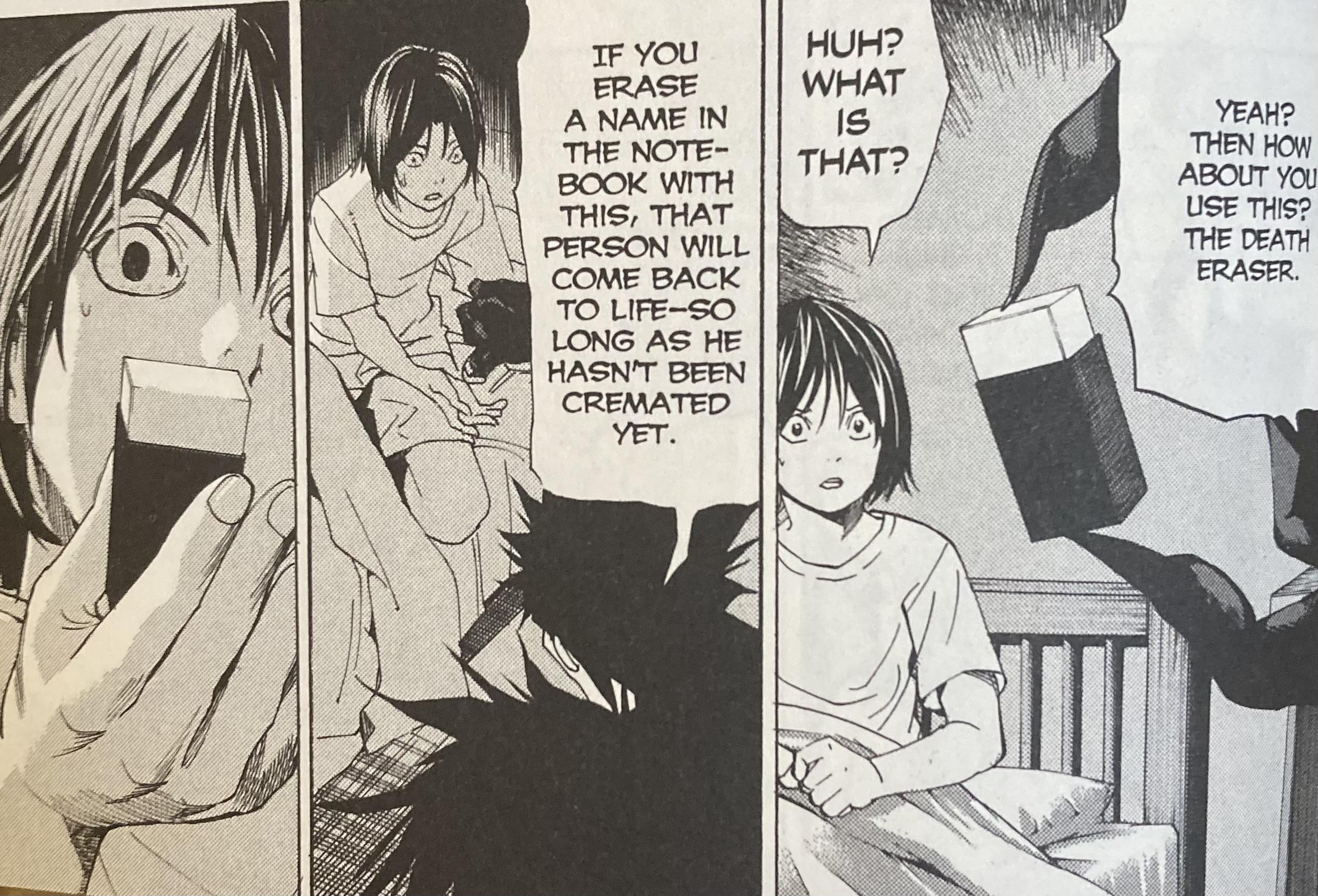 >>287644391All the people in that one-shot died from heart attacks so those are the only rules we have. You have to assume "cremation" means the body being destroyed, so any form of bodily harm that would kill you like decapitation should theoretically prevent it from working, or something like your organs rupturing/blood loss from a suicide would also prevent you from resurrecting.The kid also had his friend kill him with a heart attack to prove the eraser worked to the detectives and he seems to have confirmed there is something after death since Ryuk asks the kid how he enjoyed it. Makes me wonder if Ryuk was lying to Light the whole time and he is being eternally tortured for using it whereas the kid who sold the Death Note just died like normal.