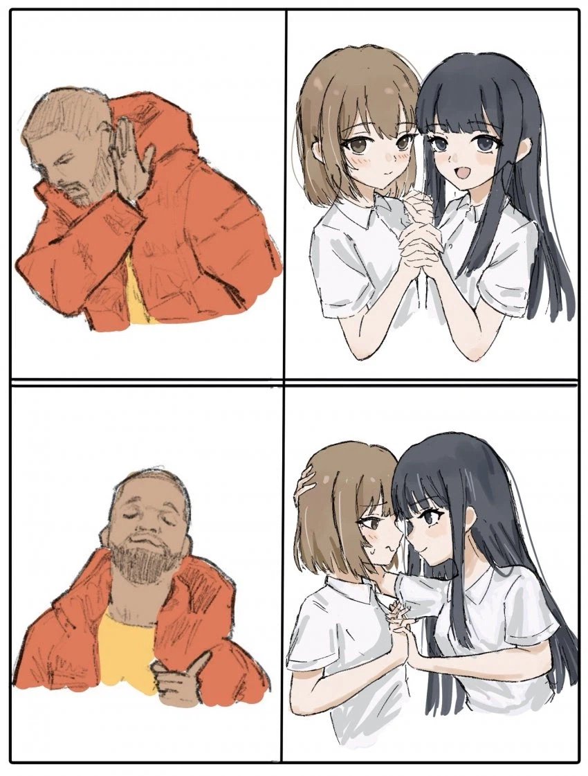 >>287689729Not really, no. But it's the nature of these Bushiroad abominations to be as appealing to everyone as possible so they'll bait but never commit to anything, and her job was to do that. But even outside of Bushiroad she hasn't actually gone out of her way to create yuri.>>287689758Funny chart anon but it's only yuri if they say that they're dating at least. I know some people in this thread have it much laxer but honestly I can't stand watching people get yuribaited by large companies. At least when it's just one author you either knew you were had, or because it's only up to oneperson they can leave it to vauge with actual intent other than making you think whatever you have to in order to buy in to their slop. Until it is deemed 100% socially and legally acceptable nothing these companies make will be yuri, just accept it and move on, no need to cope.Basically what I'm trying to say, go buy a yuri manga, and if you have some more money to spare you can spend it on other things you like, like bandori and that's just fine because you like it.
