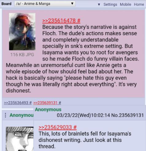 >>287721371>Whereas sane people say why did he write his fake world such that nuking the world was basically the only choice, then walk it back?Rather than walking it back, I think it's just poor writing and rushing to the end due to burnout. He wanted to make a scenario for the rumbling where Eren wasn't evil but basically cornered into it and overdid it. And at the same time I think he had long since planned for Armin to be some kind of hero at the end since his whole thing is that he's so smart and can always find another solution (not saying this is executed well, but that's how he's portrayed), hence the whole serumbowl thing and "armin is going to save the world!!!" but the situation was so fucked up the only way for the alliance to succeed was with asspulls. None of the world politics in this thing make any sense and it's all explained with infodumps during flashbacks.