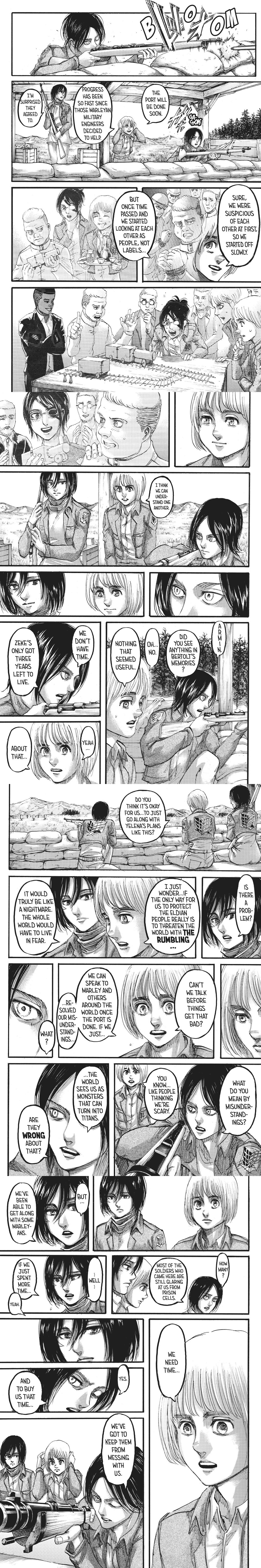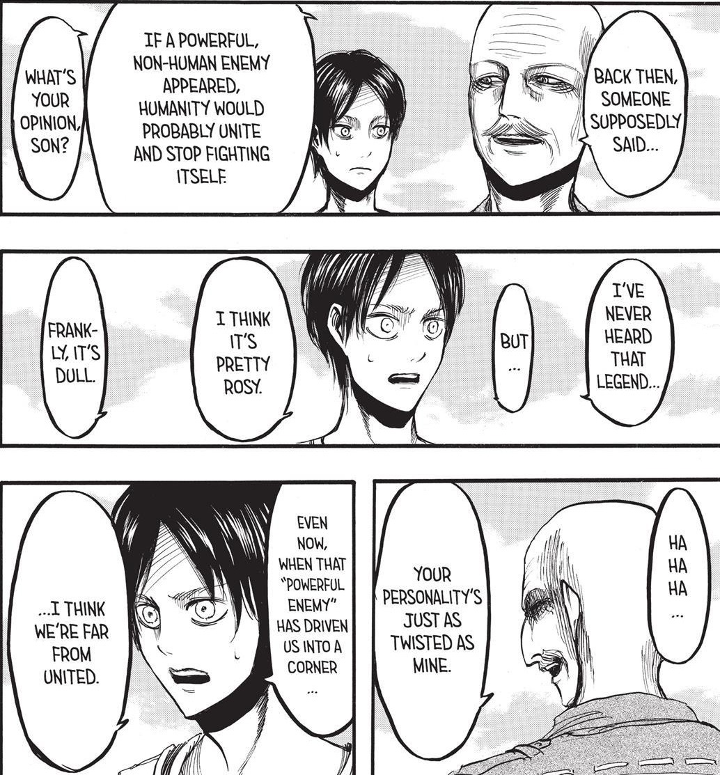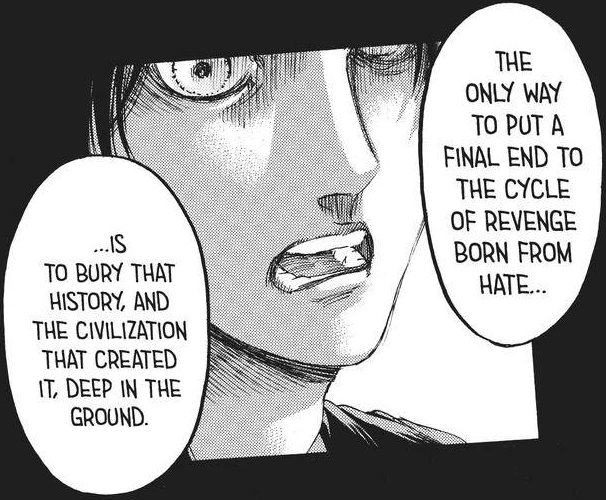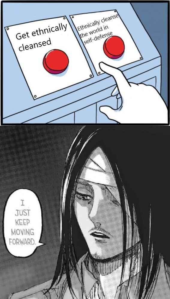 >>287728669Anon, again.Its not a matter of language or heroism.People can delude themselves with “hur eren had so many options, he was just evil and wanted to exterminate everyone because he was evil” all they want, but continuing missing the big wall titan in the room.What else he could do?!All the “solutions” involved him sacrificing people dear to him, and one was literally just a self suicide.Both clashed with his own person and the whole “we are special because we were born into this world”Every peaceful solution not involving the rumbling failed.The point of Marley arc was that there was no other way anymore, the whole world declared war and genocide against the island.Some for fearSome for hatredSome for economical and warfare advantage (either stealing the founder titan or mining down the iceburst stone)Some because they were weak countries and could just tag with the strongest ones in order to gain advanatage.None in the world was ready yo advocate for the paradisians, even the not-japanese were there nust for the iceburst stone…and even these guys were ready to use the partial rumbling to cripple other nations for their own gain.Eren was literally desperated and had no other choice left.