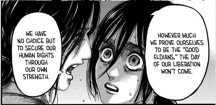 >>287733595Anon.The point is that regardless of the tones or the direct words.The truth is that Eren had no other ways aroundIt is literally the reason why he burst into crying at Ramzey during 130 in the liberio flashback (see >>287724814)Its not a matter if eren looks heroic or savage.Regardless of the words he chooses and if he display empathy or not with them…eren still was left with no other solutions.Any peace was going to fail.The solutions presented to him were horrifying and involved to sacrifice people he was not ready to sacrifice.The whole world was going to exterminate them and still would’ve hated them.Of course it sucks for the innocent people across the globe that were powerless and had no direct involvement with the war, or the very unlucky tribes that had nothing to do with Eldians…but by then there is nothing eren could do for them.It was either kill or be killed, without knowing were these people are located and how to keep them alive while storming everyone else.. the only solution he could archive is a complete global genovide without dinstinctions or exceptions.It wasn’t a matter of being heroic or evil, it was that eren was legt with no choice. People were not cheering at him because “YAS KILL ALL THESE GLOBOHOMO,NAZI FOR THE WIN”, but “damn this is horrifying but the story is really deep and showed what a cruel and bad thing Eren must do to save the people he cares about…that’s actually deep and interesting”Learn the differences.Even if you don’t agree with Eren or find his words too aggressive and evil…the fact is that it was the sole solution eren could’ve accepted because of his character journey