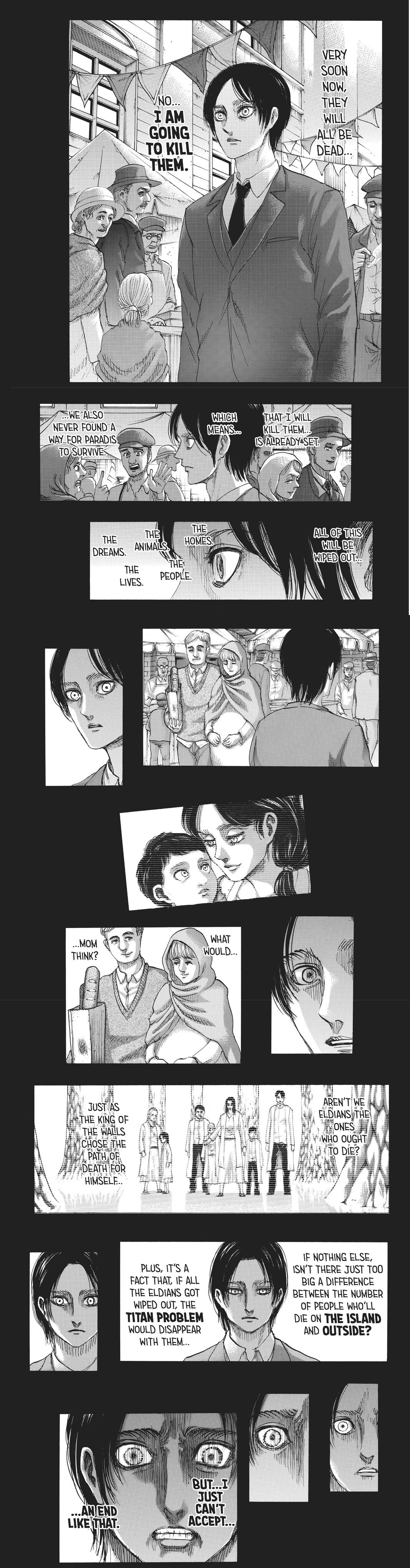 It's just a retarded ending overall. The Attack Titan having memories that transcend time and space was stupid. Ymir and the worm were stupid. Eren retroactively taking responsibility for tons of shit including killing his own mother is stupid.I don't buy that he's redeemable.